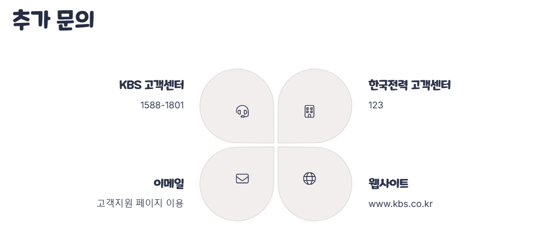 온라인이 어렵다면 전화나 우편을 이용할 수 있습니다. KBS 고객센터 1588-1801 또는 한전 고객센터 123으로 전화해 주세요.
