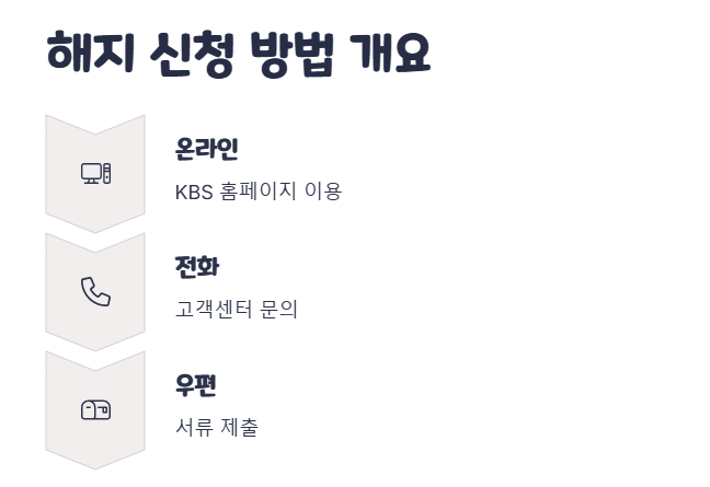 가장 빠른 방법은 KBS 홈페이지를 통한 온라인 신청입니다. KBS 홈페이지에 접속하여 로그인 후 수신료 해지 신청 메뉴를 클릭하세요.