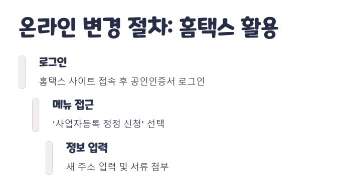 홈택스에 로그인한 뒤, ‘사업자등록 정정(변경) 신청’ 메뉴를 찾으세요.