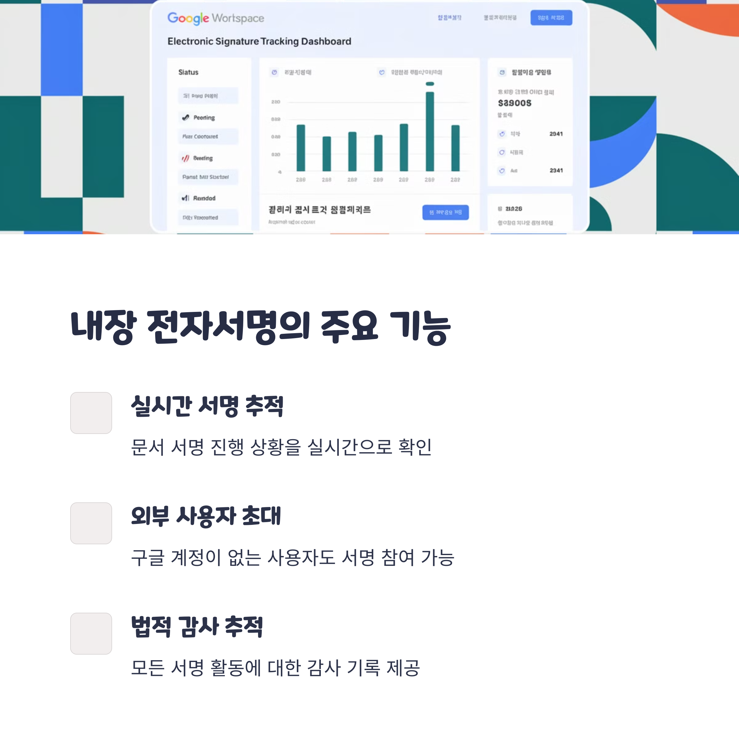 eSignature는 Google Workspace 사용자를 위해 설계된 기능이에요. PDF 업로드는 물론, 구글 문서에서 직접 서명을 삽입하고 관리할 수 있습니다.