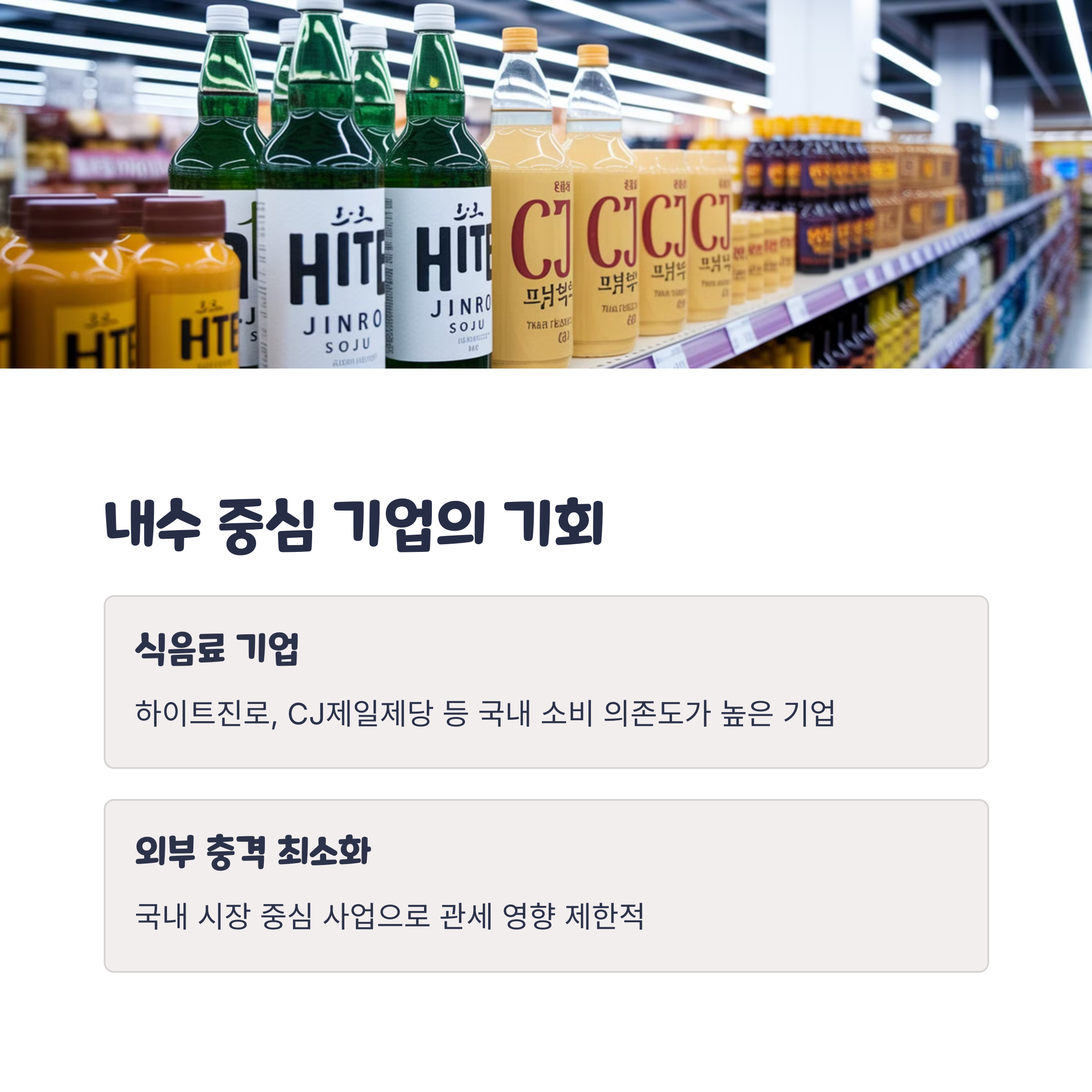 | 내수 중심 식음료 | 하이트진로, CJ제일제당 | 수출 비중 낮아 영향 적음 |