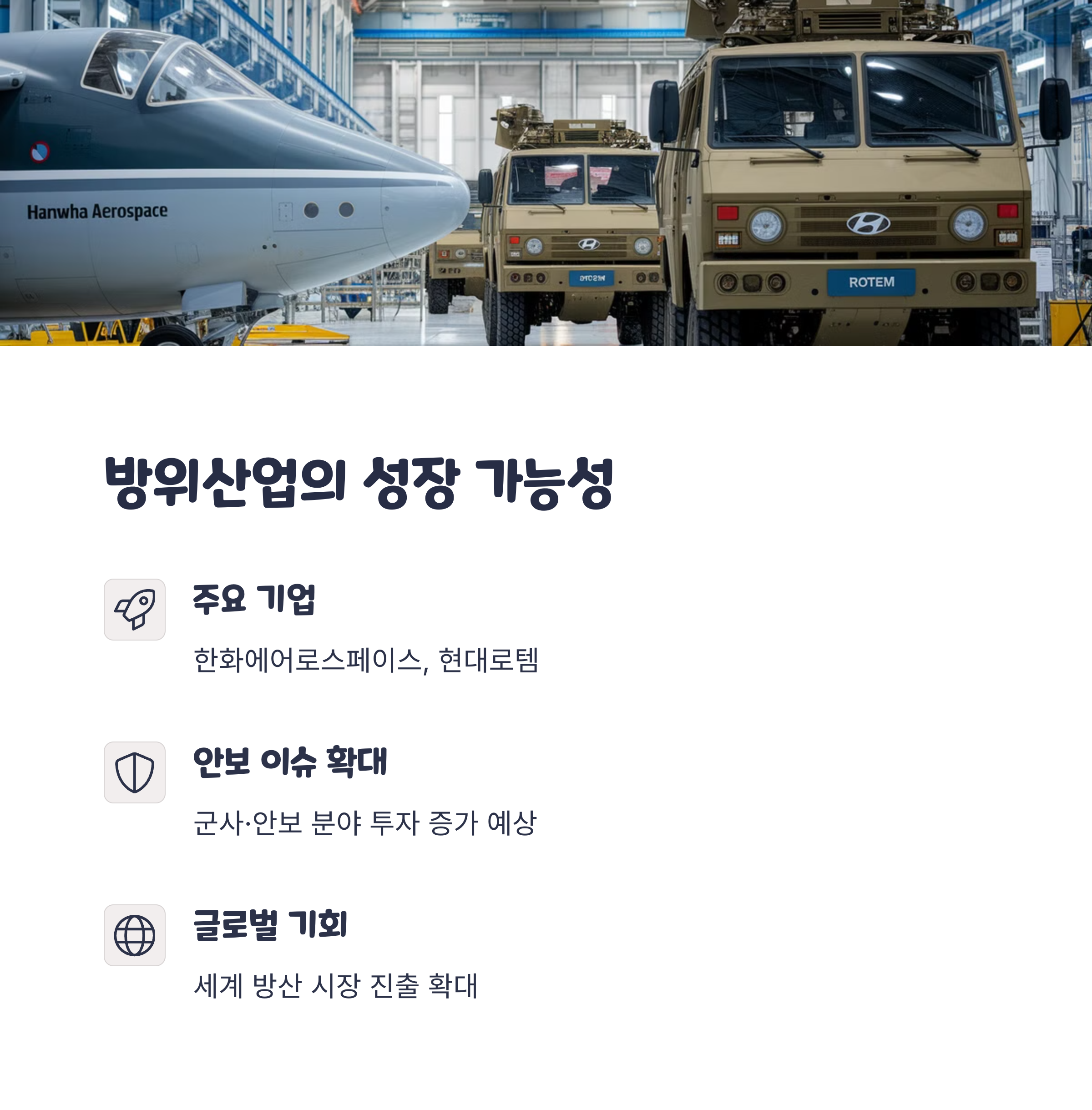 | 방산 | 한화에어로스페이스, 현대로템 | 안보 강화 수요 증가 기대 |