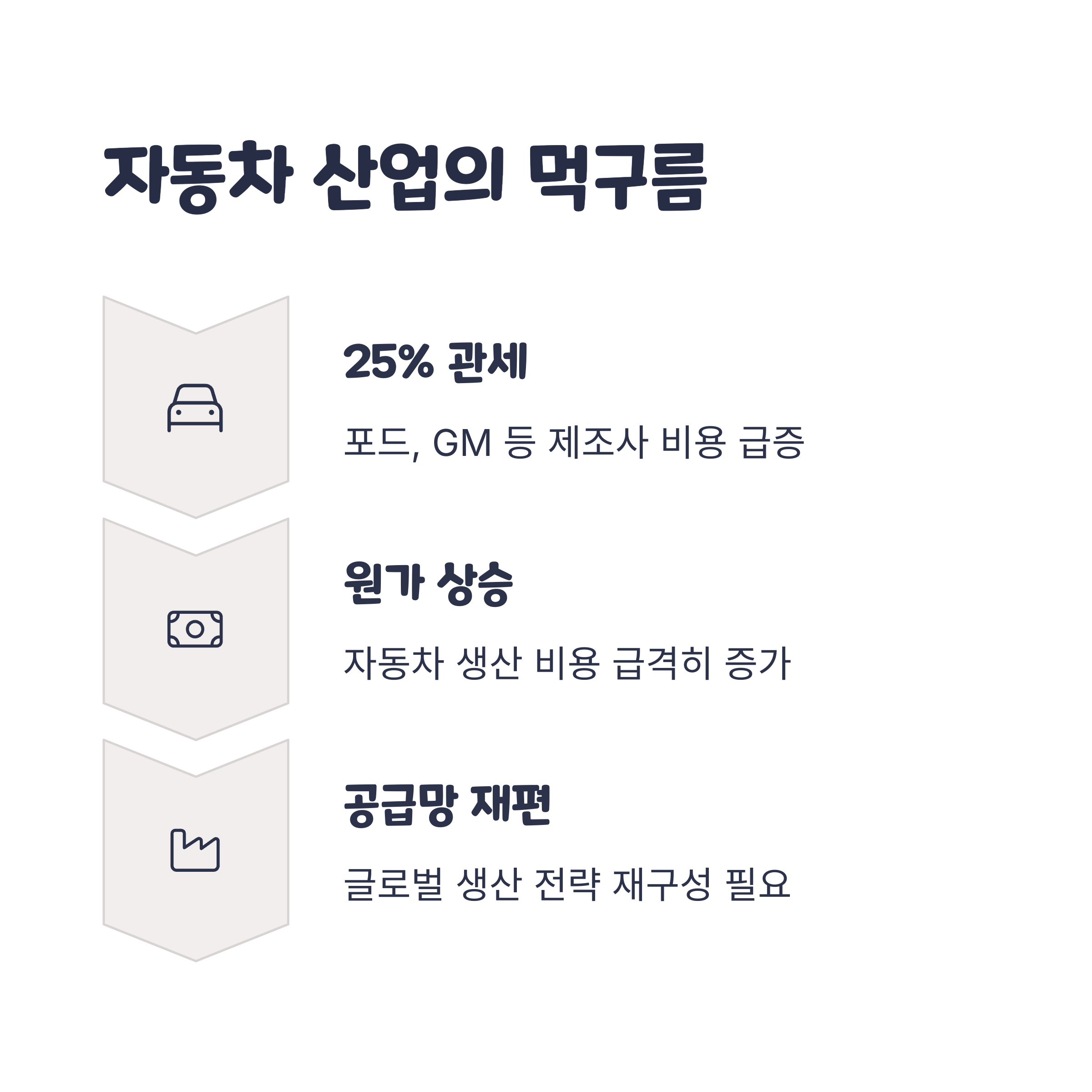 Ford, GM, Stellantis 등 미국 주요 자동차 제조업체들이 타격을 입고 있습니다. 트럼프 대통령은 자동차 및 부품에 대해 25% 관세를 부과하겠다고 발표했습니다.