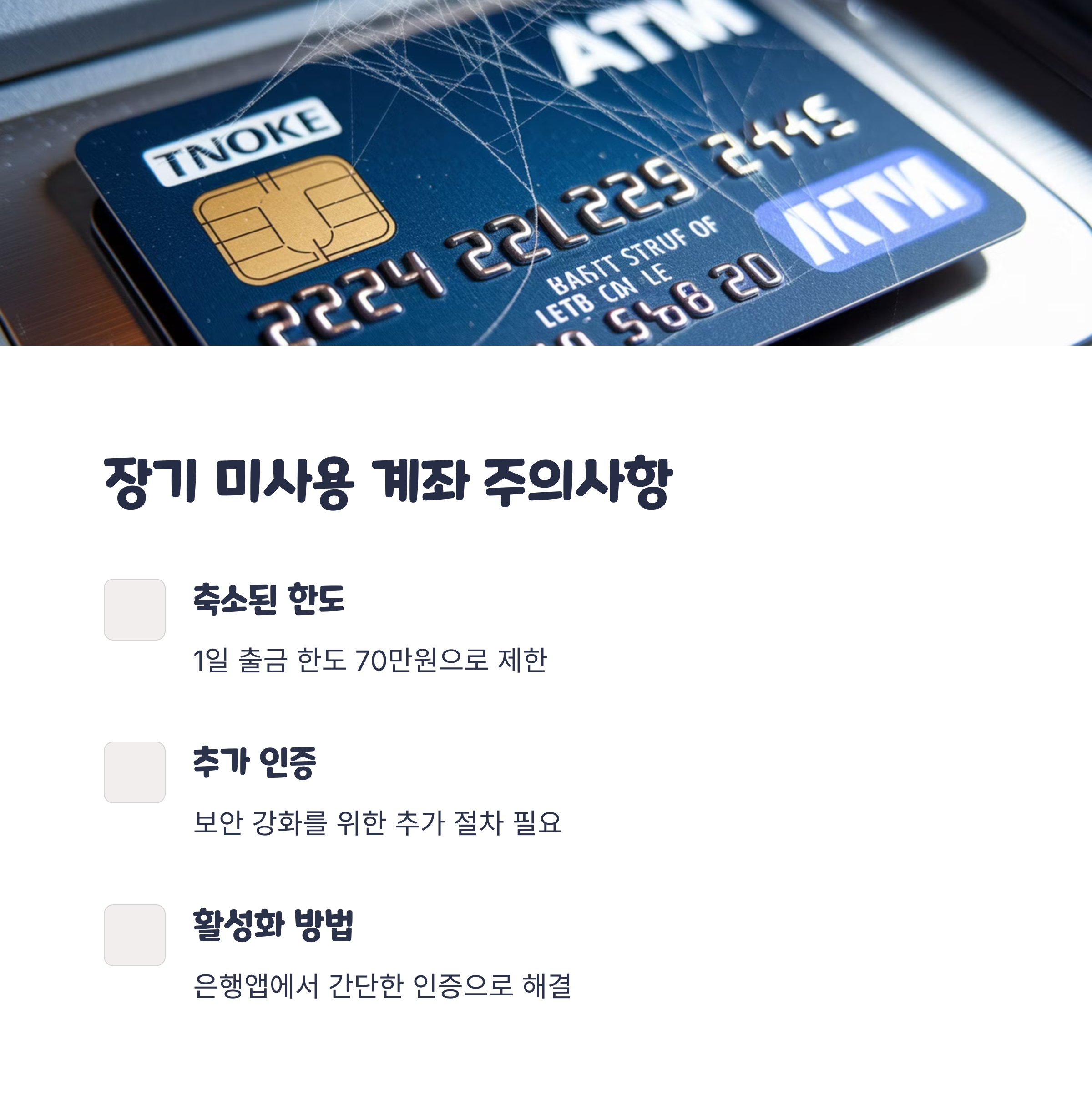 일정 기간 동안 거래가 없는 계좌는 장기 미사용 계좌로 분류됩니다. 이 경우 출금 한도가 1일 70만 원으로 제한될 수 있습니다. 안전한 계좌 사용을 유도하고, 금융 사고를 방지하기 위한 조치입니다.