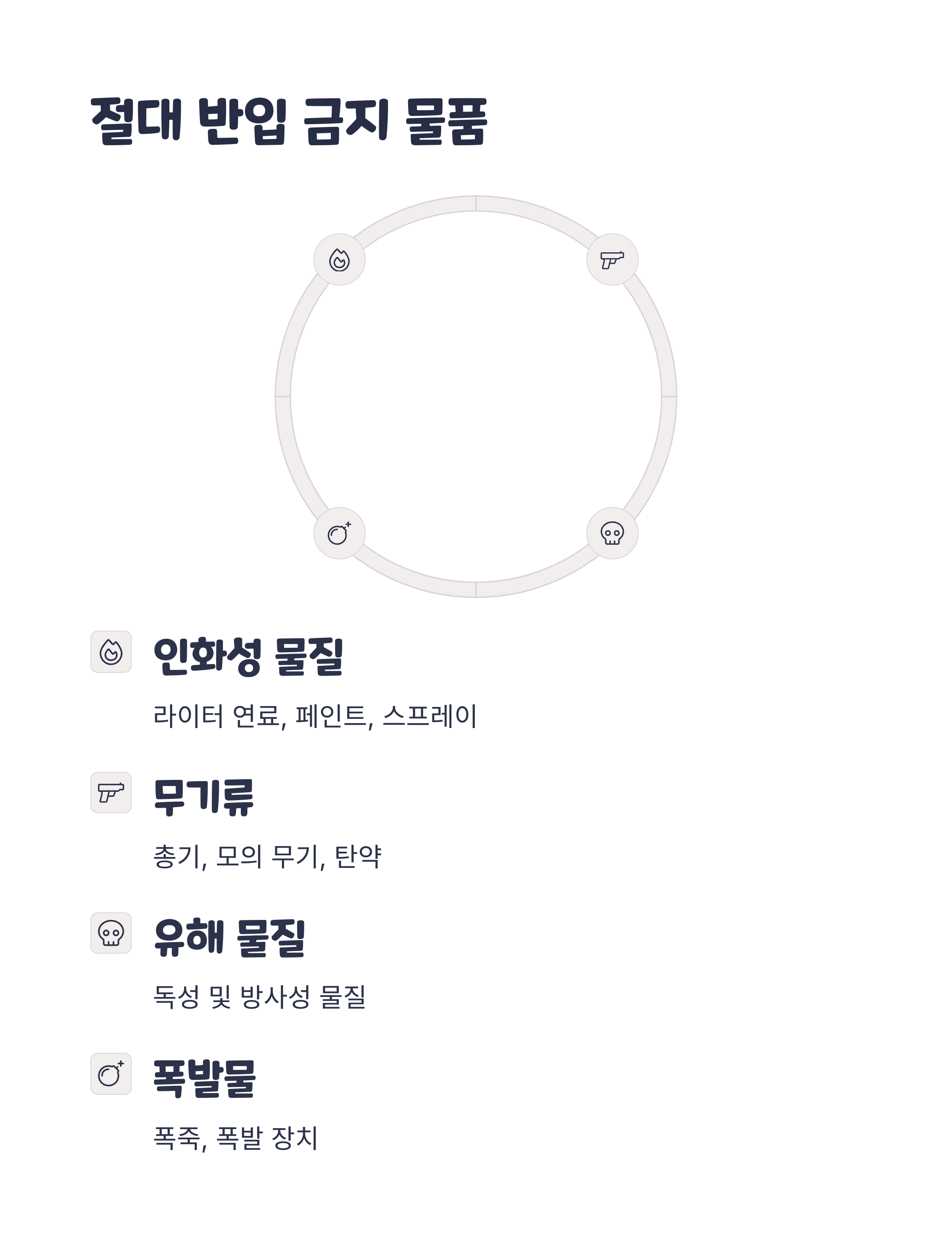 인화성 물질, 무기류, 스프레이 제품은 기내 반입이 금지되어 있습니다. 헤어 스프레이, 살충제, 페인트 등은 압력과 온도로 인해 위험할 수 있습니다. 이 외에도 위험한 화학제품, 소화기, 부탄가스 등도 항공기 반입이 불가합니다.