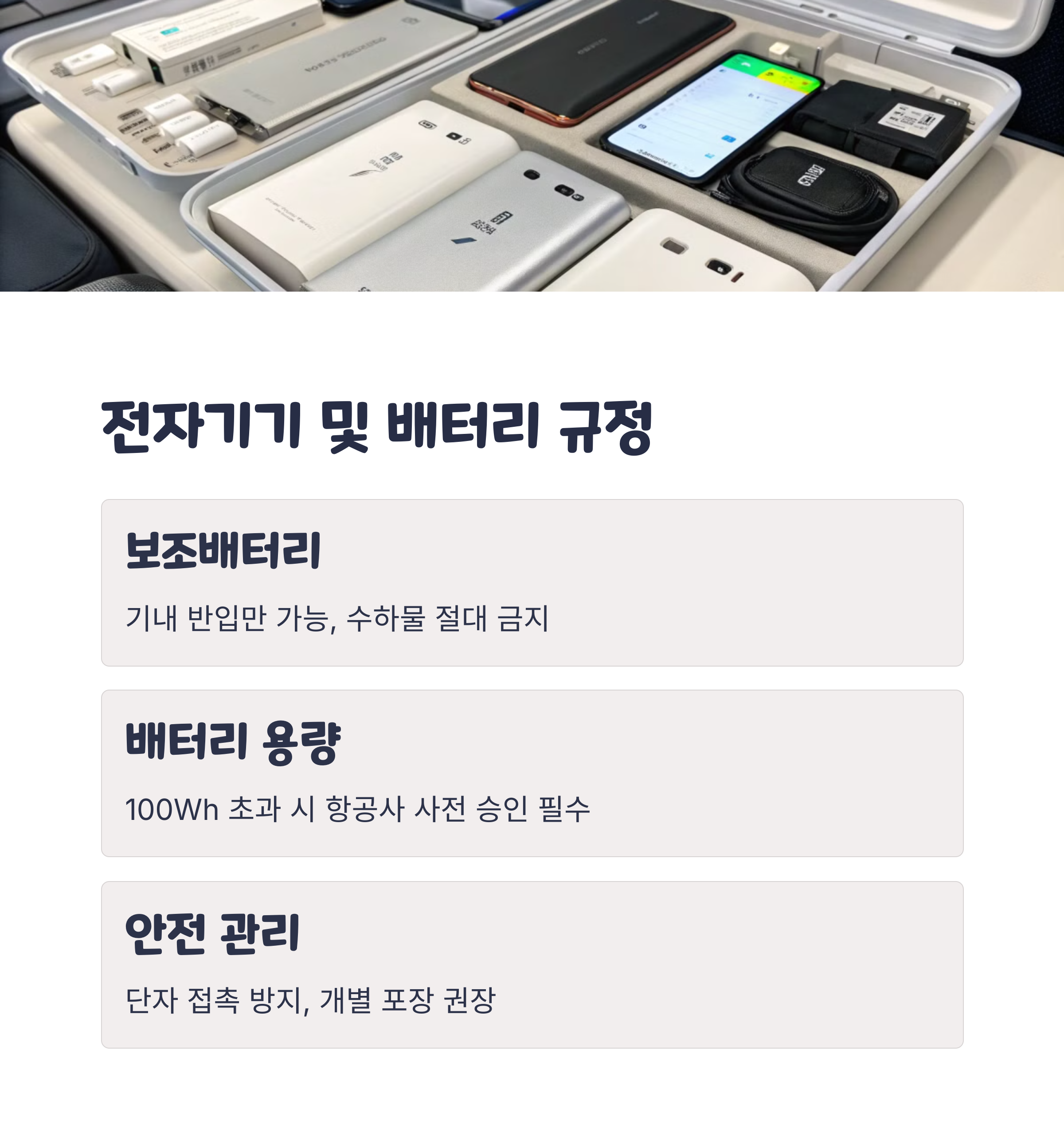 보조배터리는 기내 반입만 가능하며, 위탁 수하물로는 절대 불가합니다. 100Wh 이하는 별도 승인 없이 반입할 수 있지만, 100Wh 초과 시에는 항공사 승인이 필요합니다. 160Wh 초과하는 제품은 반입 자체가 금지됩니다.
