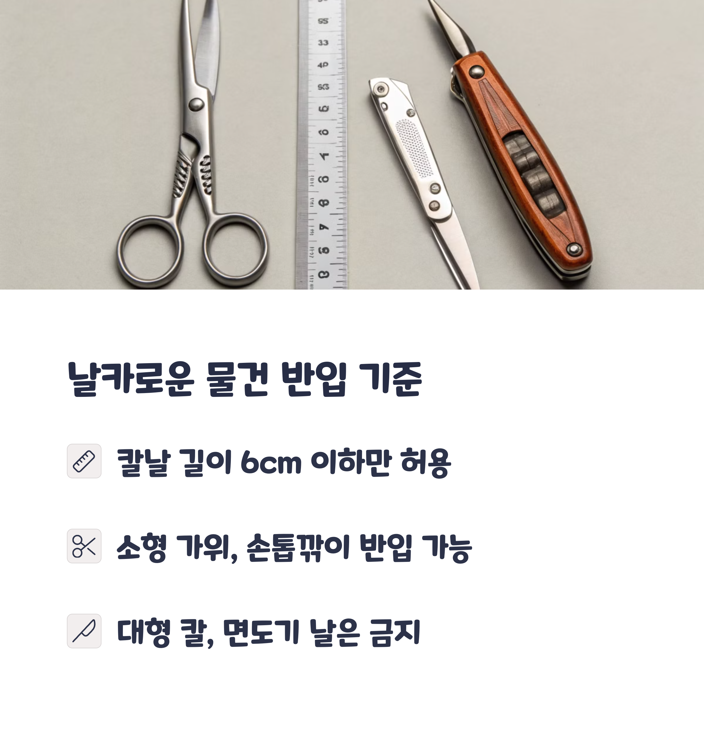 칼날 길이 6cm 이하인 칼은 일부 항공사에서 반입이 가능하지만, 대부분은 금지하는 추세입니다. 날카로운 물건은 보안 검색에서 문제가 될 수 있으니, 가능하면 수하물로 보내는 것이 안전합니다. 다용도 공구, 드라이버, 가위 등도 기준을 초과할 경우 반입이 불가능합니다.