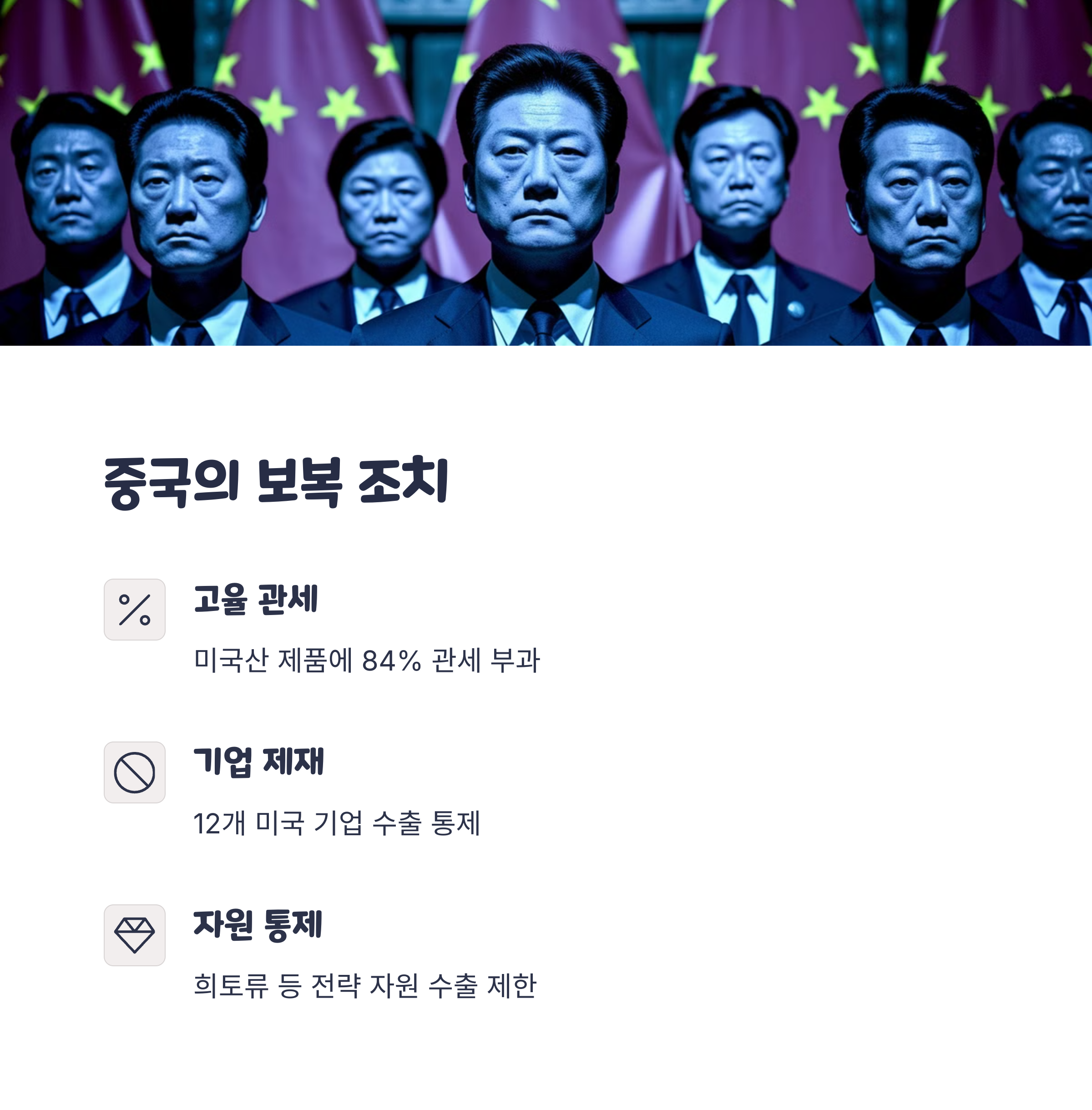 중국은 미국의 고율 관세에 동등한 수준의 관세 인상으로 대응함과 동시에, 수출 규제 및 기술 통제를 병행하고 있습니다. 이는 단순한 보복 차원을 넘어, 전략적 자원의 통제권을 활용하려는 의도로 해석됩니다.