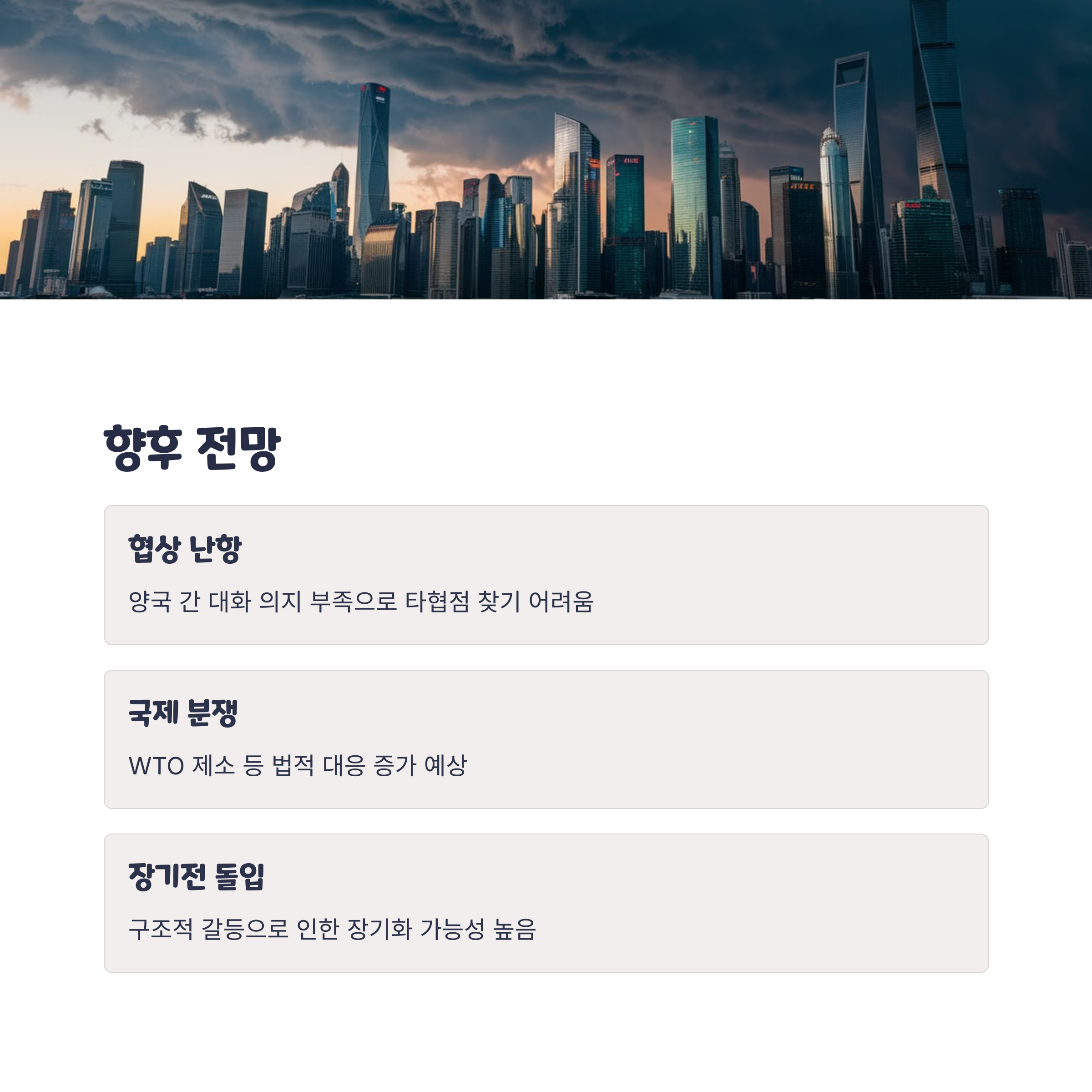 미중 간 관세 갈등이 단기적으로 끝나지 않을 것이란 분석이 많습니다. 양국 모두 자국의 전략적 이익을 포기할 의사가 없어 보이며, 갈등은 더 복잡한 국면으로 이어질 전망입니다.