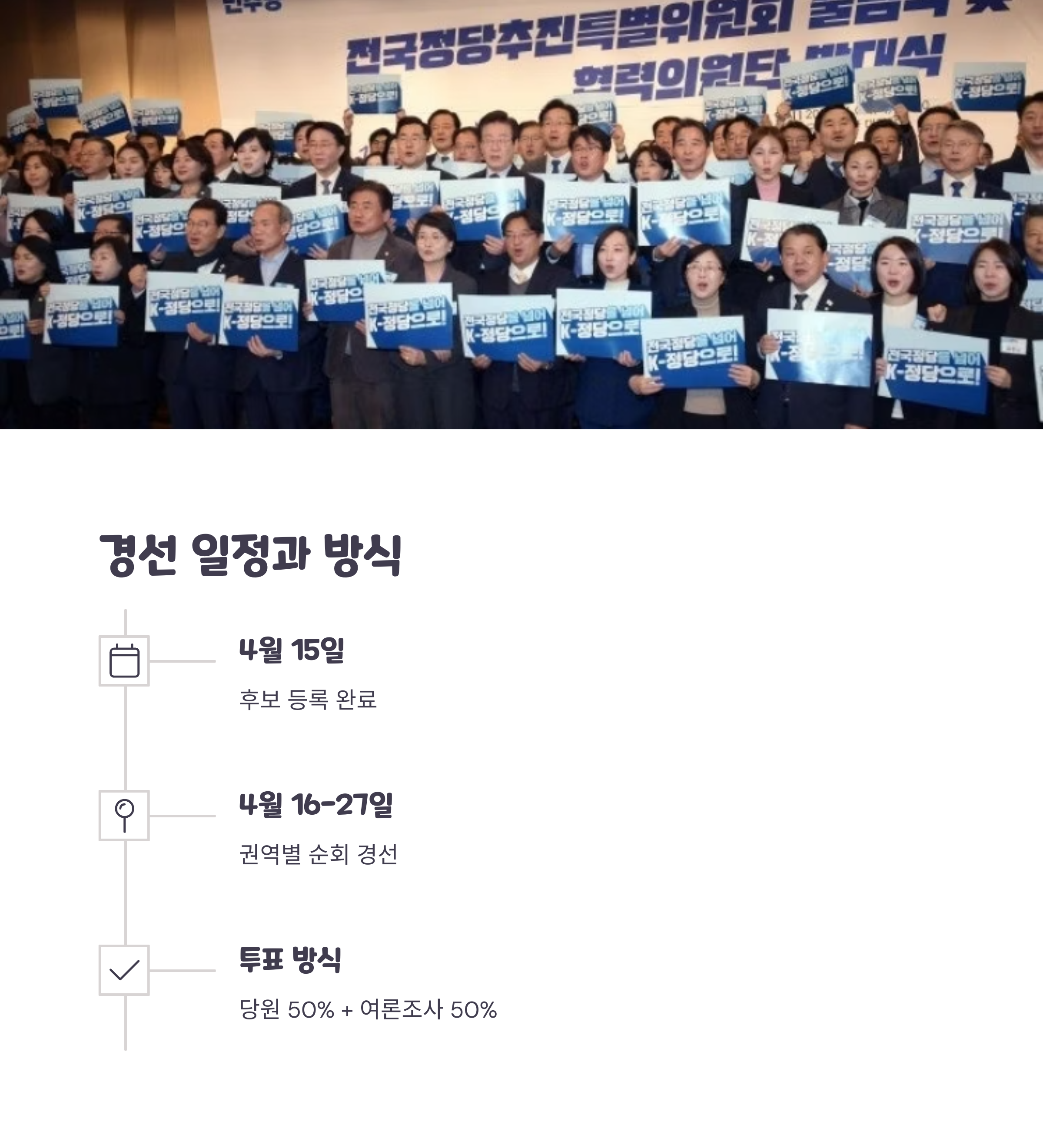 더불어민주당은 4월 15일 대선 후보 등록을 완료한 뒤, 16일부터 27일까지 권역별 순회 경선을 진행합니다. 경선 지역은 충청, 영남, 호남, 수도권으로 나뉘며, 일정에 따라 순차적으로 실시됩니다. 이번 경선은 권리당원 투표 50%와 국민 여론조사 50%를 반영하는 방식으로 치러집니다.