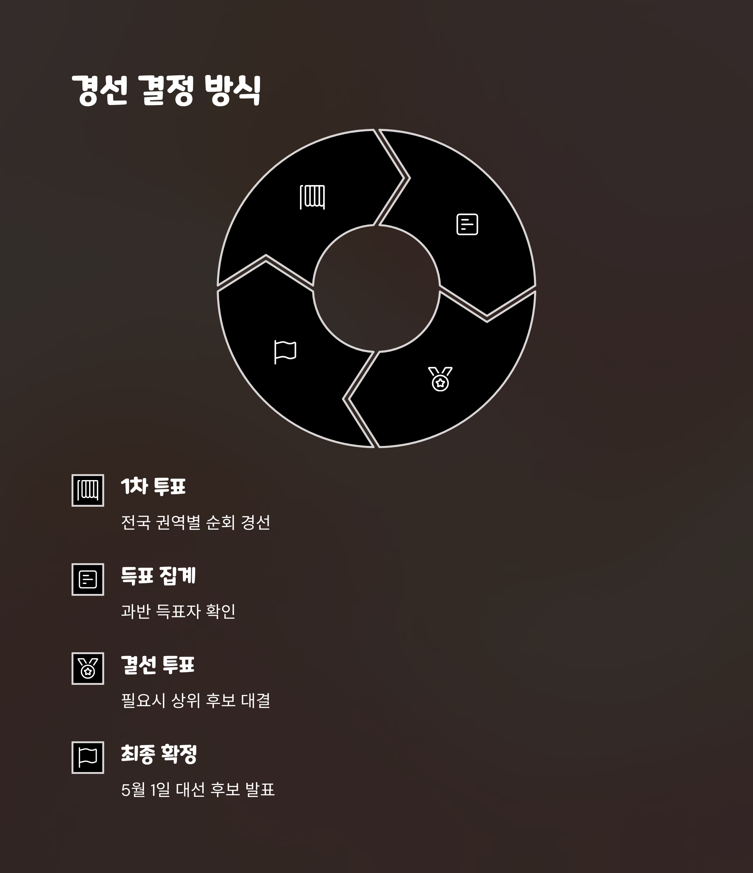경선의 득표율 산정 방식과 지역별 민심, 여론조사 추이는 모두 변수로 작용합니다. 과반 후보가 없을 경우 5월 1일 결선 투표로 이어지며, 마지막까지 예측 불가능한 양상이 될 것으로 보입니다.