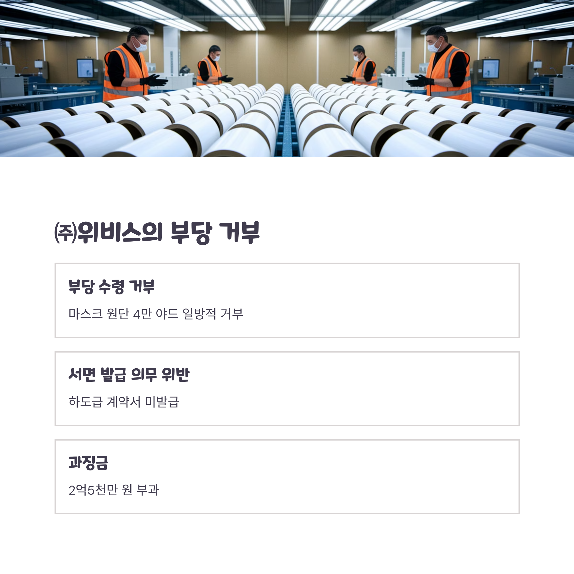 최근 공정거래위원회는 ㈜위비스의 하도급법 위반 행위에 대해 시정명령과 함께 2억5천만 원의 과징금을 부과했습니다. 이 회사는 마스크용 원단을 위탁하면서도 수급사업자 책임이 아님에도 일방적으로 수령을 거부했죠. 또한 하도급 계약서 서면 발급 의무를 위반했습니다.