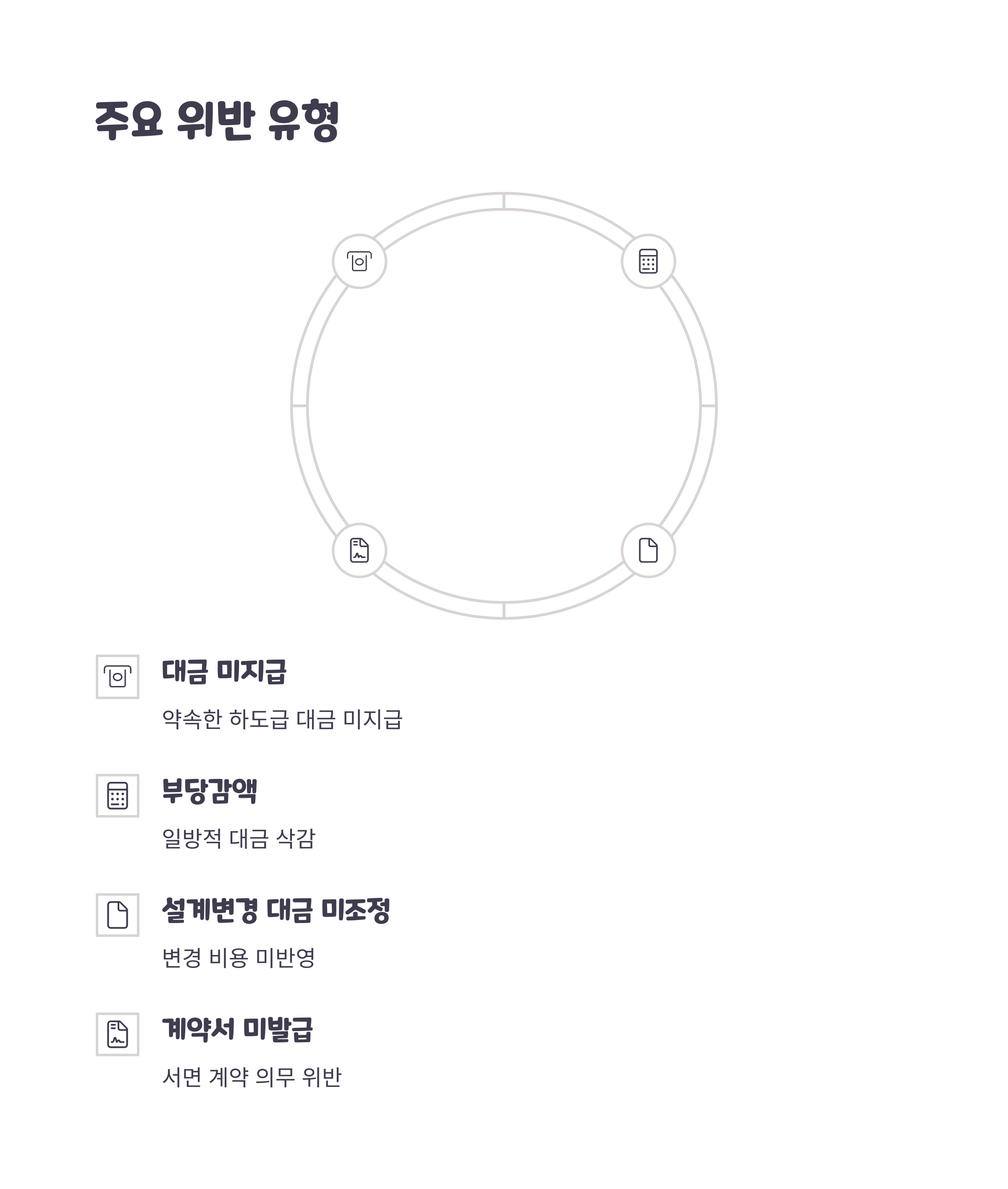 건설 및 제조업 분야에서는 하도급대금 미지급, 부당 감액, 부당한 위탁 취소, 설계변경에 따른 대금 미조정 등의 문제가 꾸준히 발생하고 있습니다. 공정위는 이러한 위반 행위에 대해 반복적으로 적발된 사업자의 명단을 공개하며, 경각심을 높이고 있습니다.