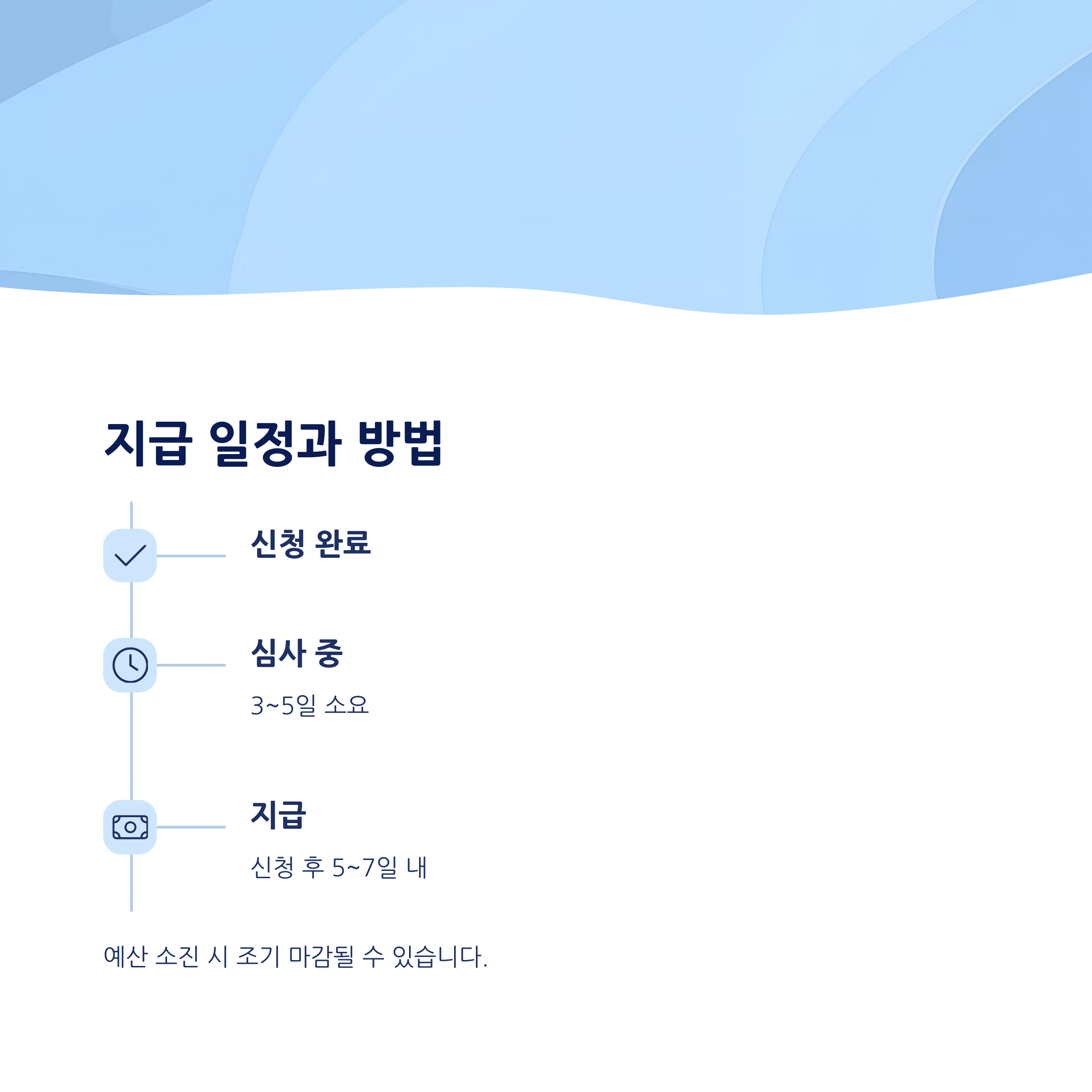 신청 후 지급까지의 소요 기간은 일반적으로 5~7일 이내입니다. 하지만 신청자가 몰리는 시기에는 다소 지연될 수 있어, 초반 기간에 신청하는 것이 보다 빠른 지급을 받을 수 있는 방법입니다.
