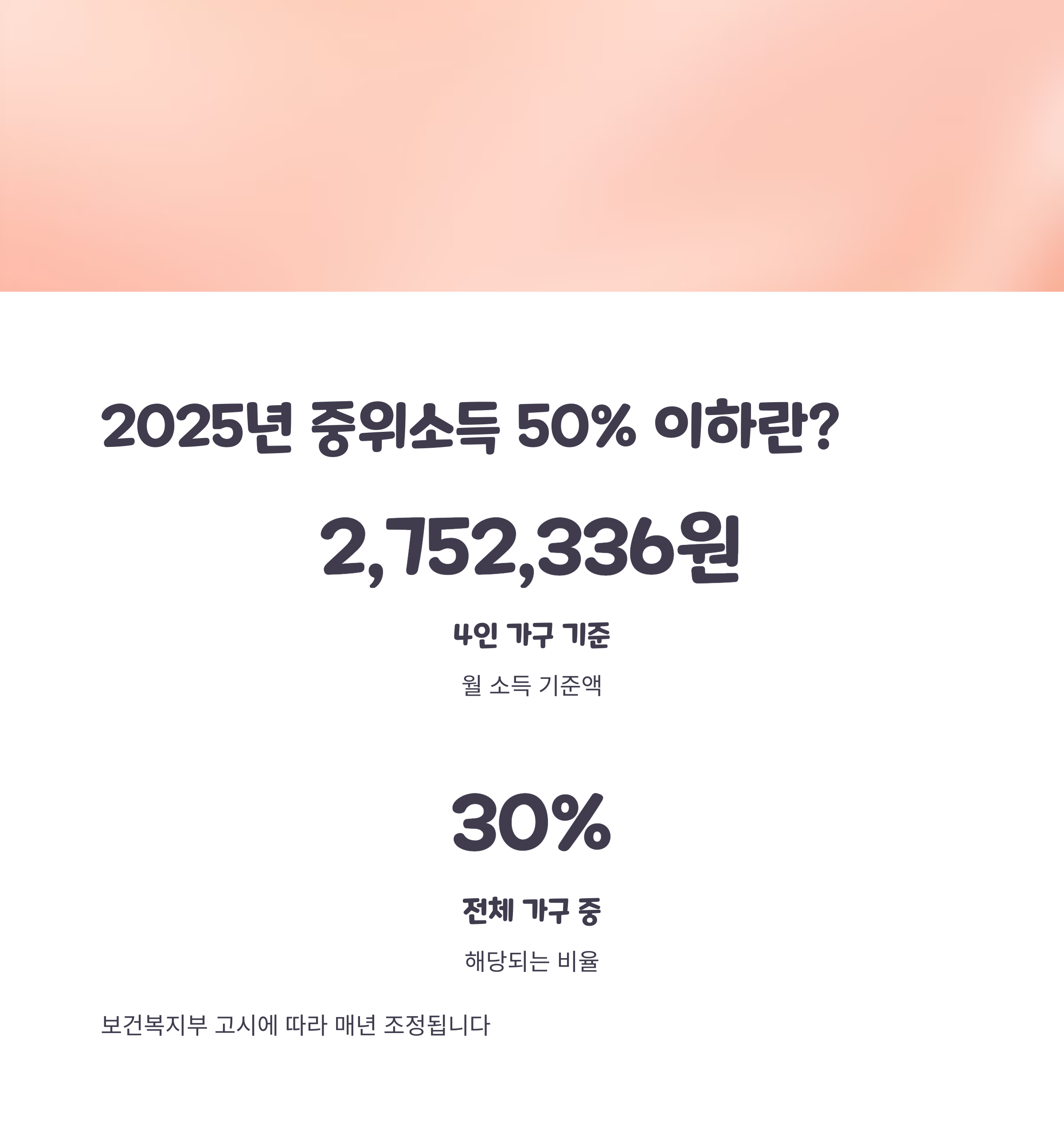 A. 2025년 중위소득을 기준으로 가구 수에 따라 50% 금액을 산정합니다. 정부 발표 자료 참고.