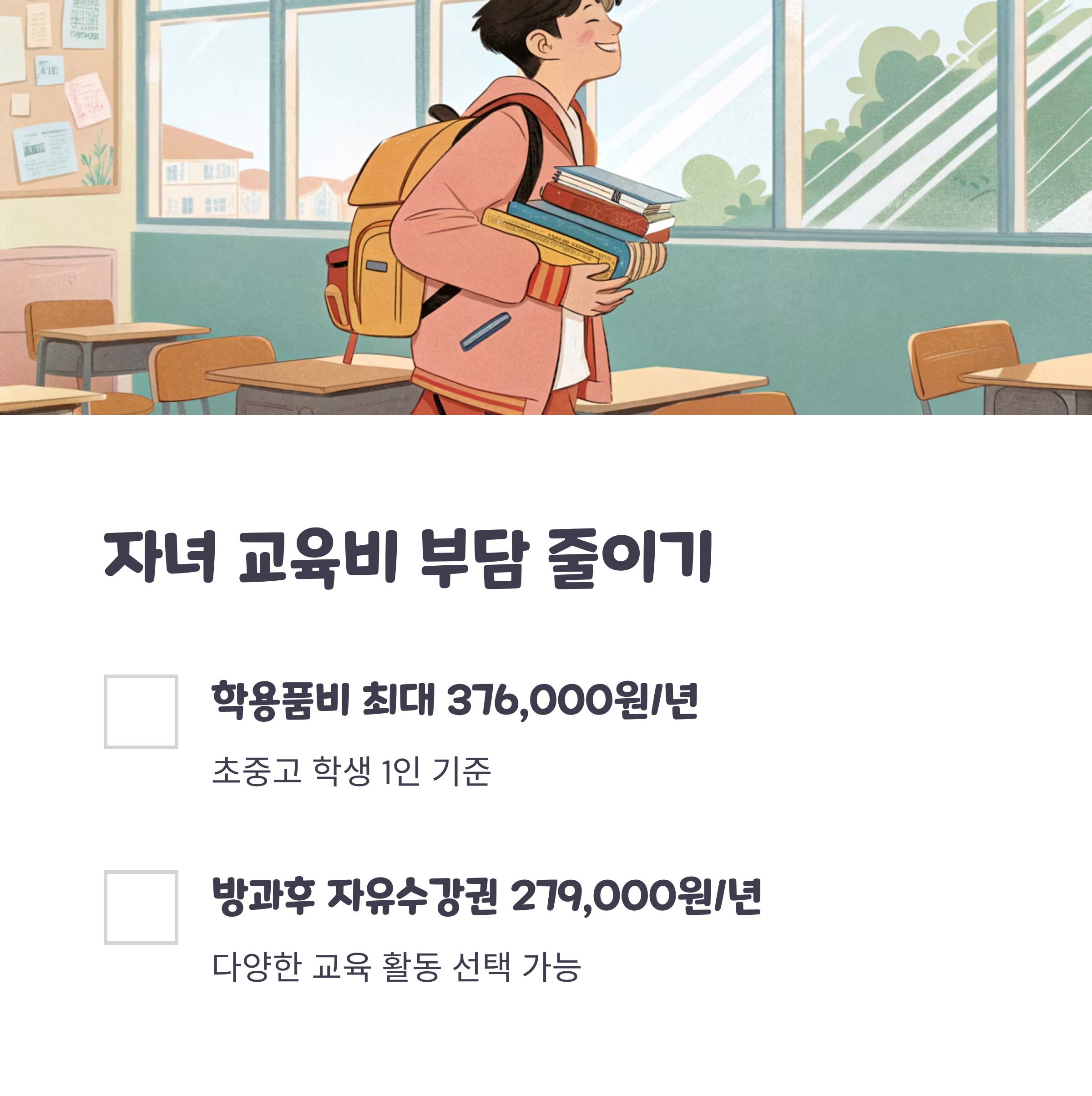 학용품비, 교복비, 방과 후 활동비 등을 지원받을 수 있으며, 연 1회 정액으로 지급됩니다.