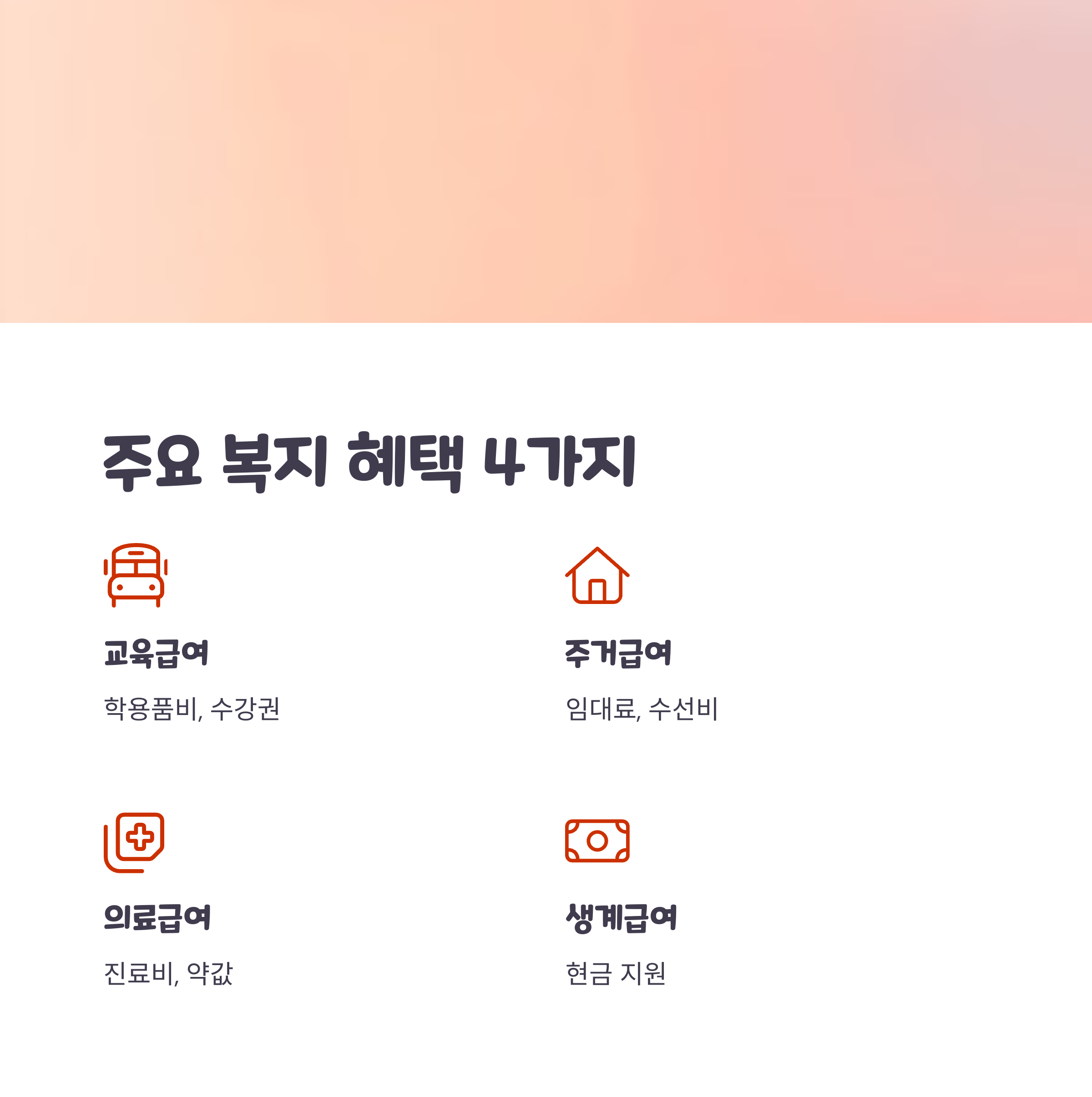 대표적인 지원으로는 교육급여, 주거급여, 의료급여, 생계급여 등이 있습니다. 각 급여는 중위소득의 일정 비율 이하인 가구를 대상으로 하며, 예를 들어 교육급여는 중위소득 50% 이하, 주거급여는 48% 이하, 의료급여는 40% 이하, 생계급여는 32% 이하 가구가 대상입니다.