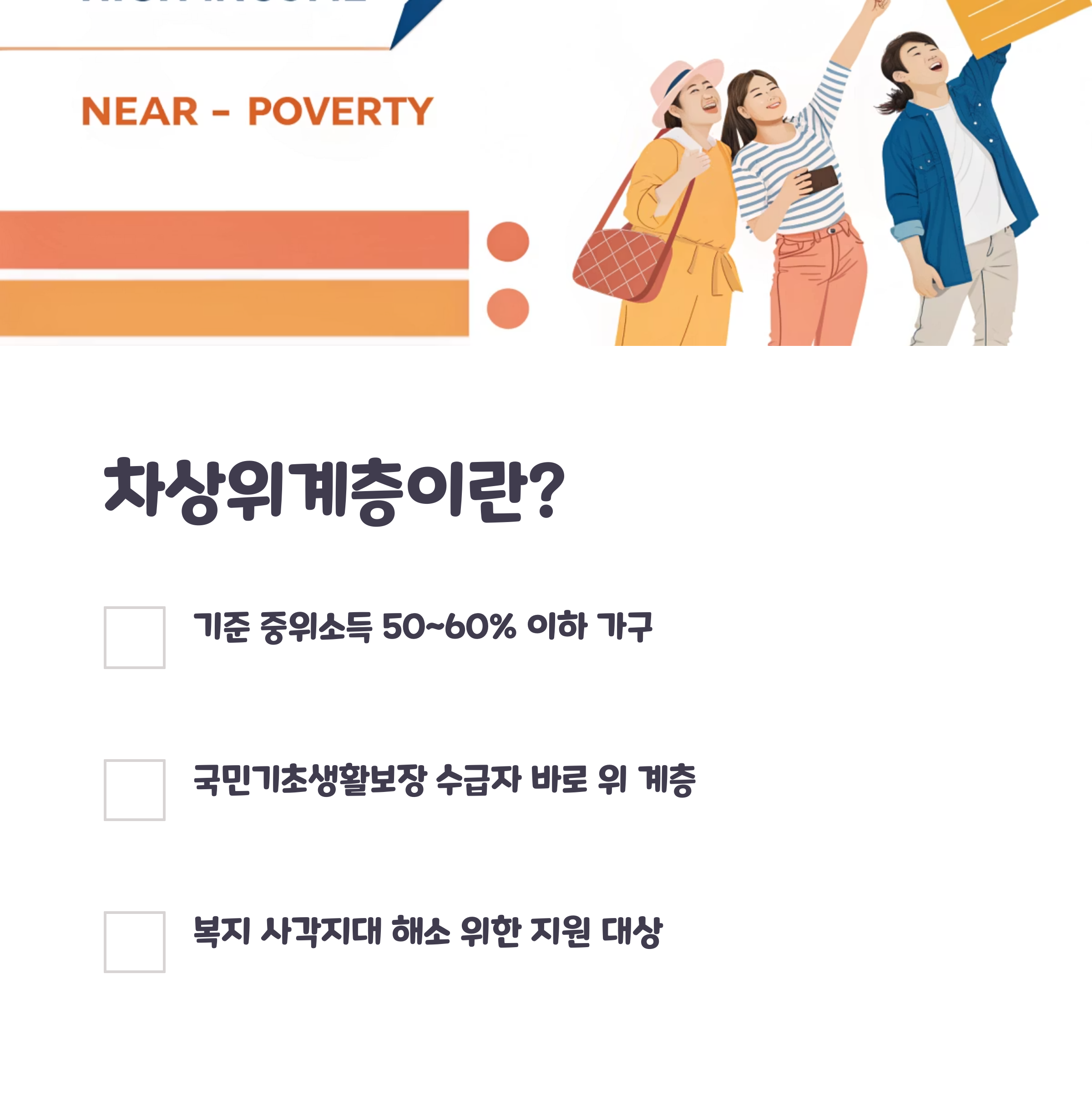 차상위계층은 정부 복지 대상 중 소득이 중위소득의 50% 이하인 가구를 말합니다.