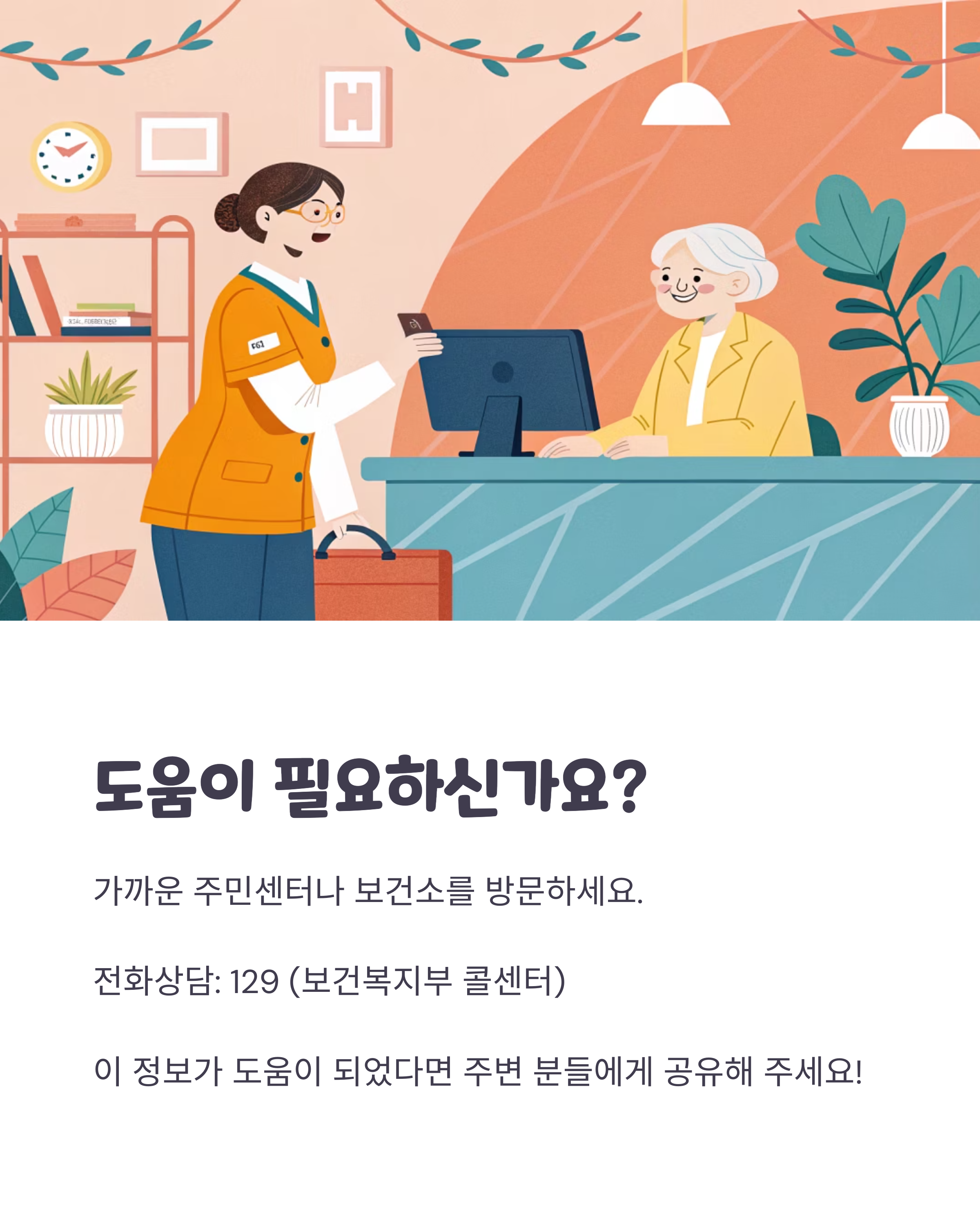 A. 보건복지상담센터(129) 또는 거주지 주민센터에서 가능합니다.