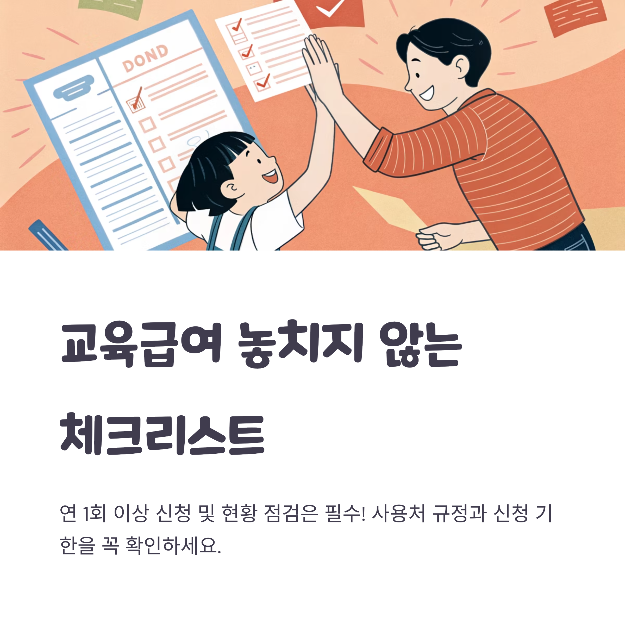 교육급여는 기준 중위소득 50% 이하 가구를 대상으로 하므로 가구의 소득이나 재산 변동이 있으면 반드시 관할 지자체에 신고해야 합니다. 미신고 시 급여가 중지되거나 환수될 수 있습니다.