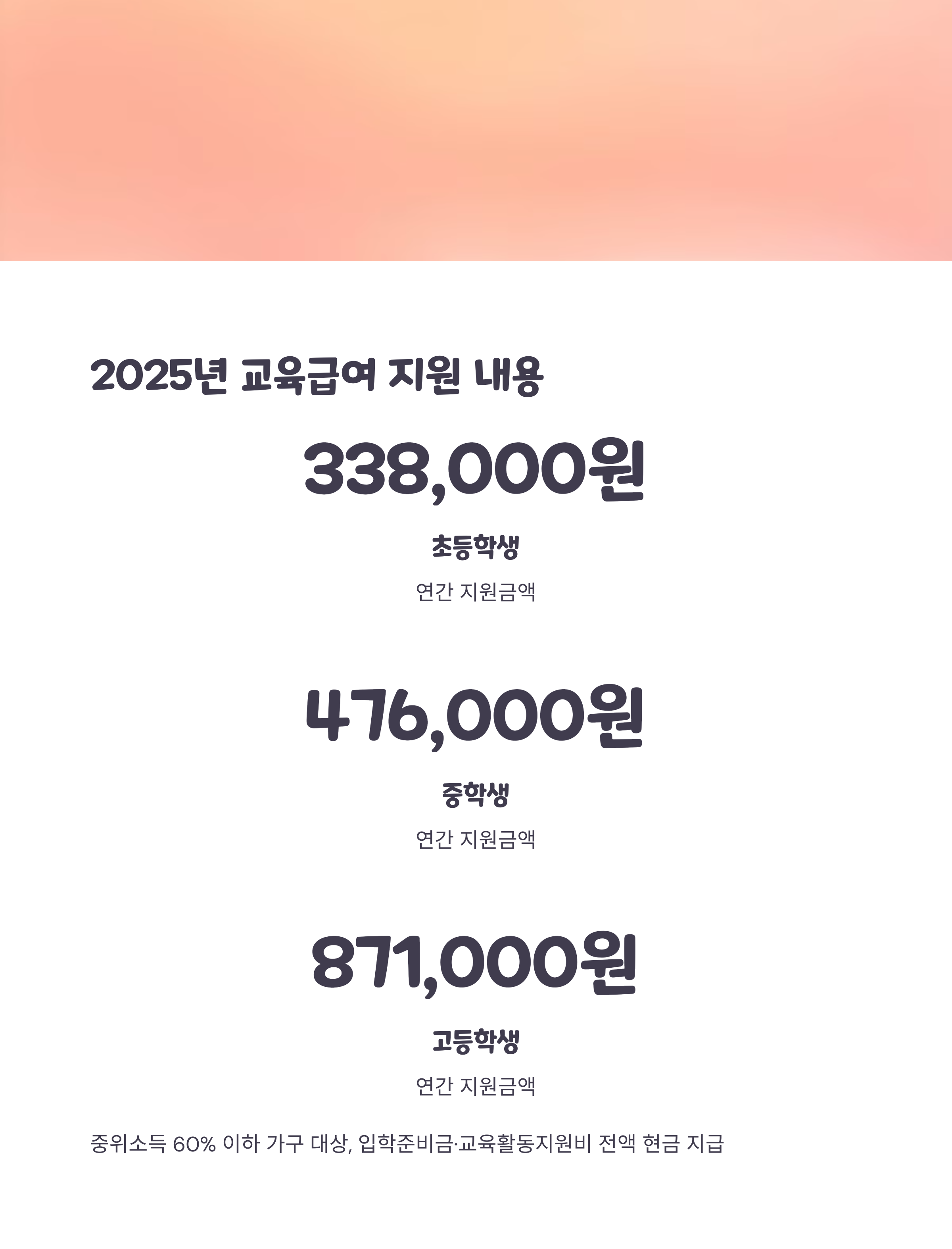 2025년 교육급여는 기준 중위소득 50% 이하 가구의 초·중·고 학생을 대상으로 연간 일정 금액을 지원합니다.