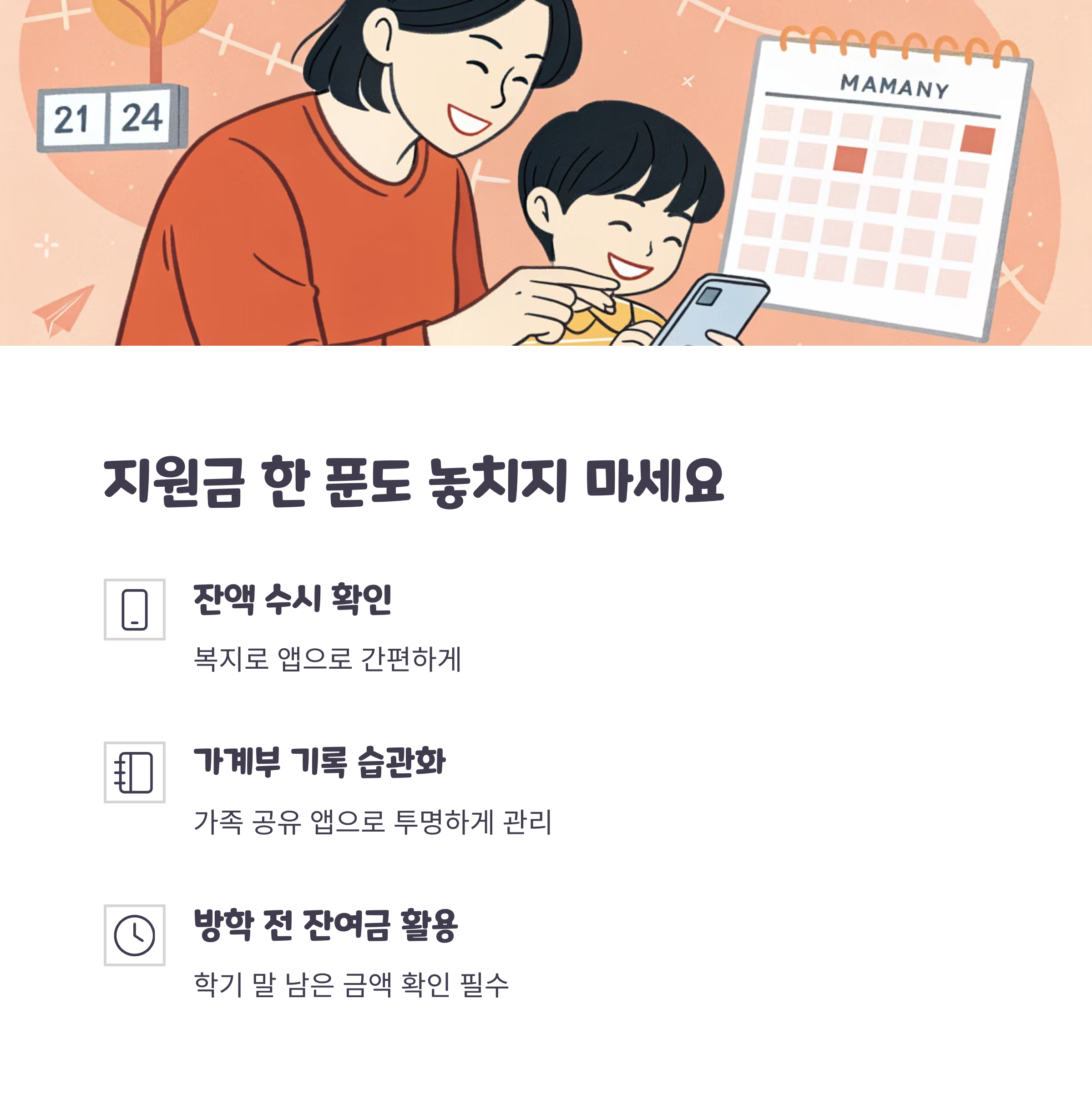 바우처는 일정 기간 내 사용하지 않으면 자동 소멸됩니다. 그래서 수령 후 바로 어디에 쓸지 계획을 세우는 것이 중요합니다. 자녀의 학기별 필요품이나 과목별 학습 도구를 정리해두면 효율적으로 사용할 수 있습니다.