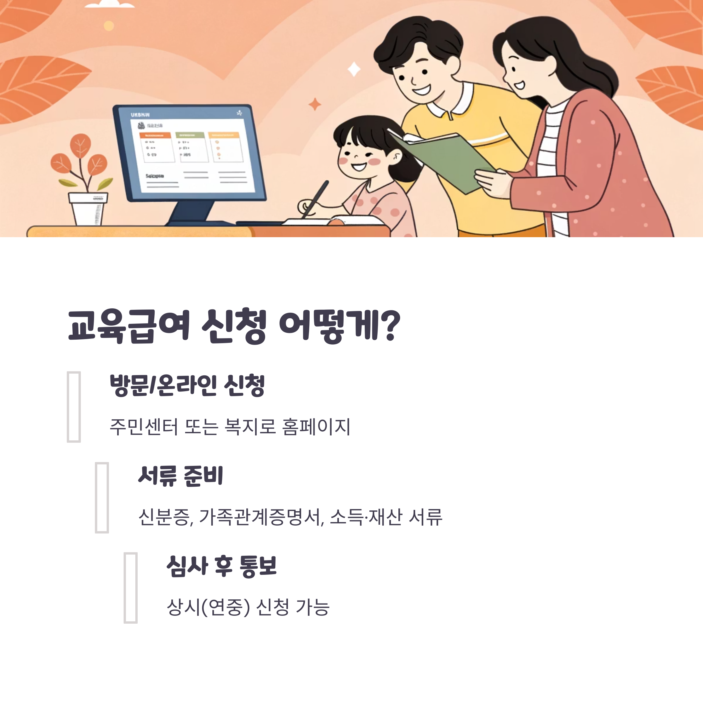 교육급여 신청은 복지로, 교육비원클릭시스템 등 온라인 사이트를 통해 가능하며, 가까운 주민센터 방문으로도 접수할 수 있습니다. 이미 수급 중이라면 별도 신청 없이 자동으로 연장되지만, 수급 내용은 반드시 확인해야 합니다.