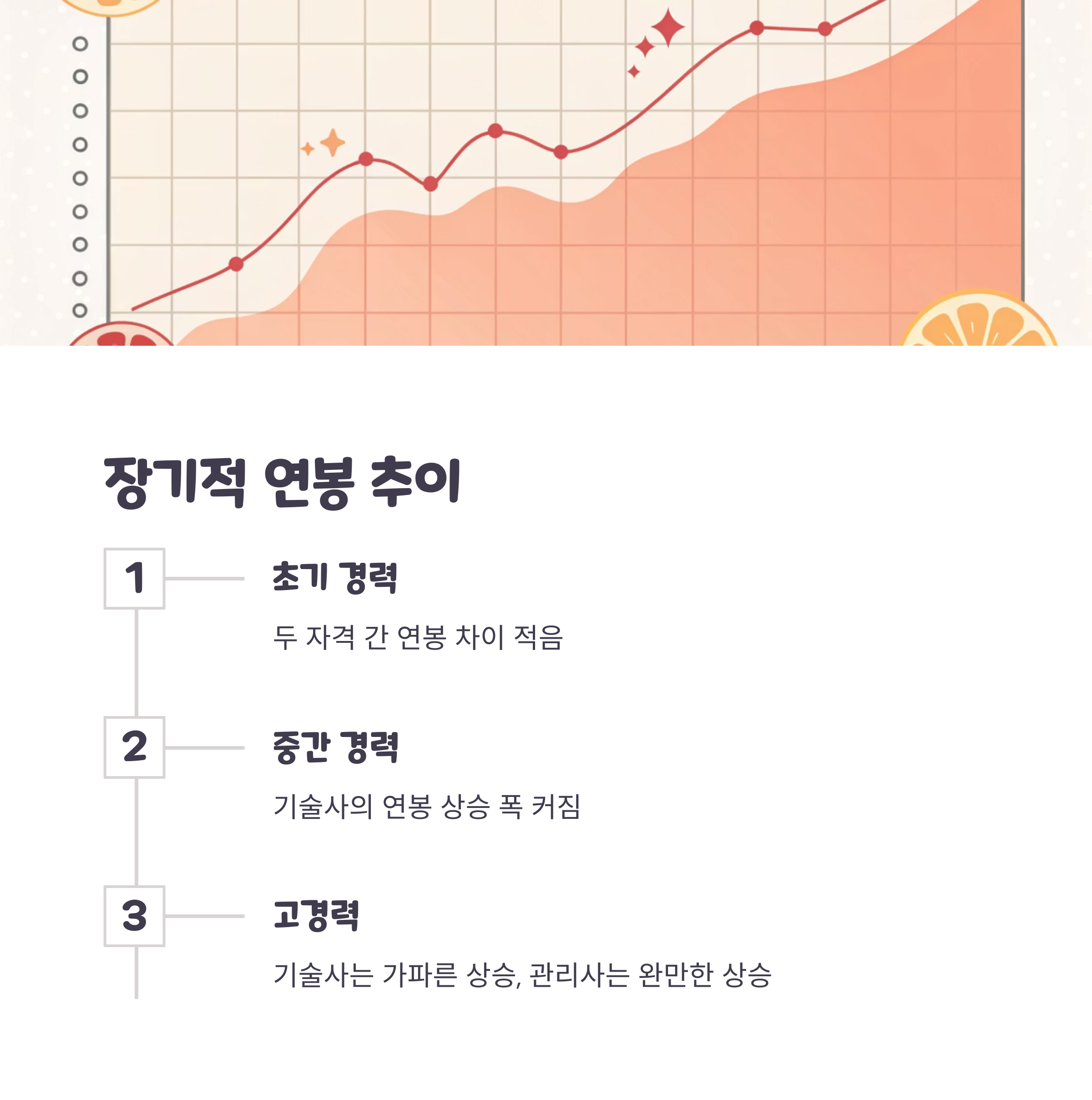 연봉 차이는 단순히 자격증의 종류만으로 결정되진 않습니다. 실무 경력이 많을수록 높은 연봉 협상이 가능하며, 수도권처럼 물가가 높은 지역에서는 급여 수준도 더 높게 책정됩니다. 또한 민간 기업, 공공기관, 건설사 등 근무처의 유형에 따라 연봉 편차가 크게 발생합니다. 프로젝트 단위로 움직이는 기술사의 경우, 업무의 크기나 참여 기간도 중요한 요인이 됩니다.
