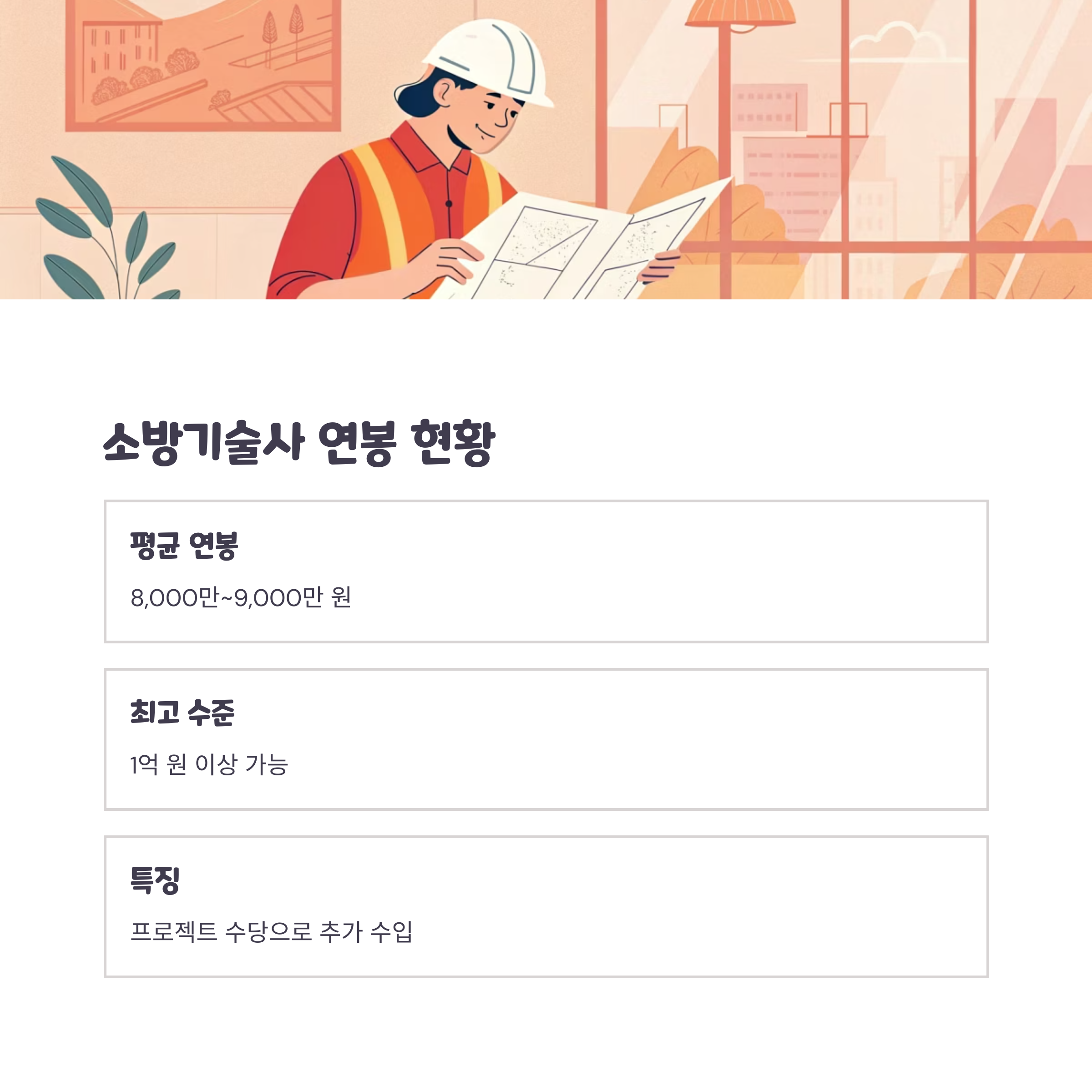 | 소방기술사 | 8,000만~9,000만 | 경력·프로젝트에 따라 1억 이상 가능 |