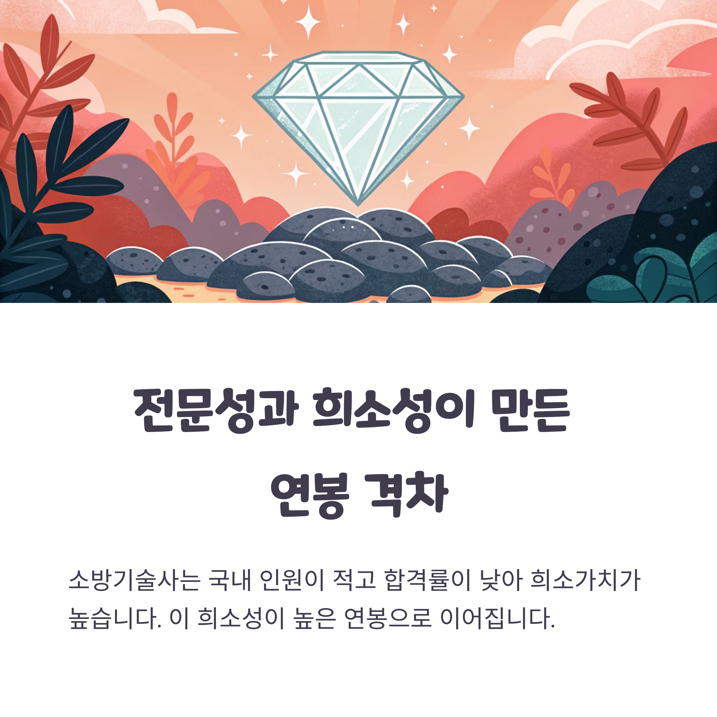 소방기술사는 국내 전체 인원이 적고 합격률도 매우 낮습니다. 그만큼 공급이 제한되어 희소가치가 높아집니다. 이로 인해 기업은 고액 연봉을 제시하면서 기술사를 채용하려 하며, 자연스럽게 평균 연봉이 상승하는 구조가 형성됩니다. 반면 소방시설관리사는 비교적 많은 인원이 활동하고 있어 시장에서의 희소성은 낮은 편입니다. 이 차이가 두 자격 간 연봉 격차를 만드는 핵심 배경입니다.