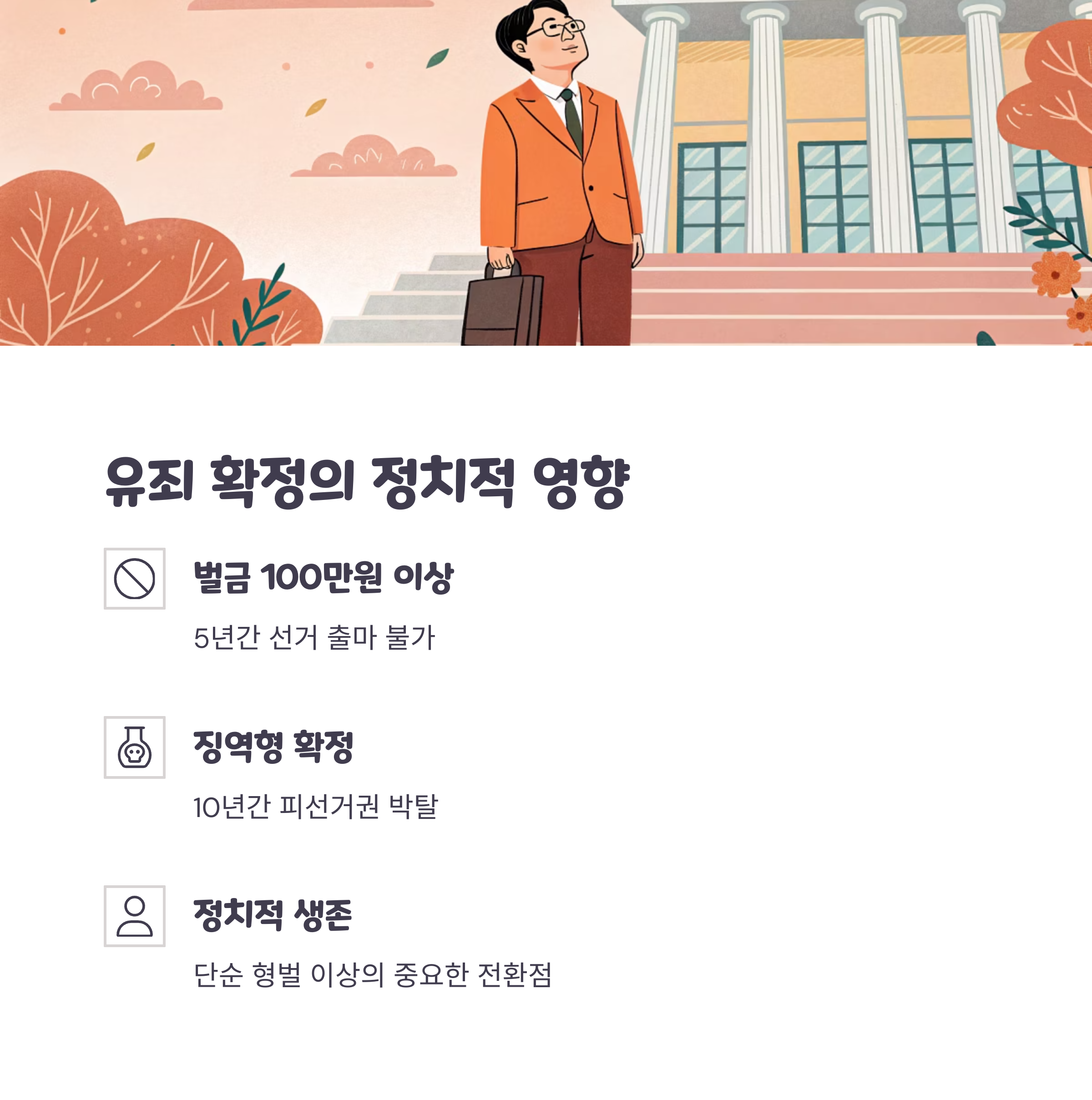 파기환송심에서 벌금 100만원 이상이 확정되면 피선거권이 5년간 박탈됩니다. 이는 향후 선거 출마에 직접적인 제한을 줍니다. 징역형일 경우 그 기간은 10년까지 연장되며, 정치인의 경우 재기까지 긴 공백기를 감수해야 합니다. 파기환송심 결과는 단순한 형벌 이상의 정치적 생존 여부를 결정짓는 중요한 전환점입니다.