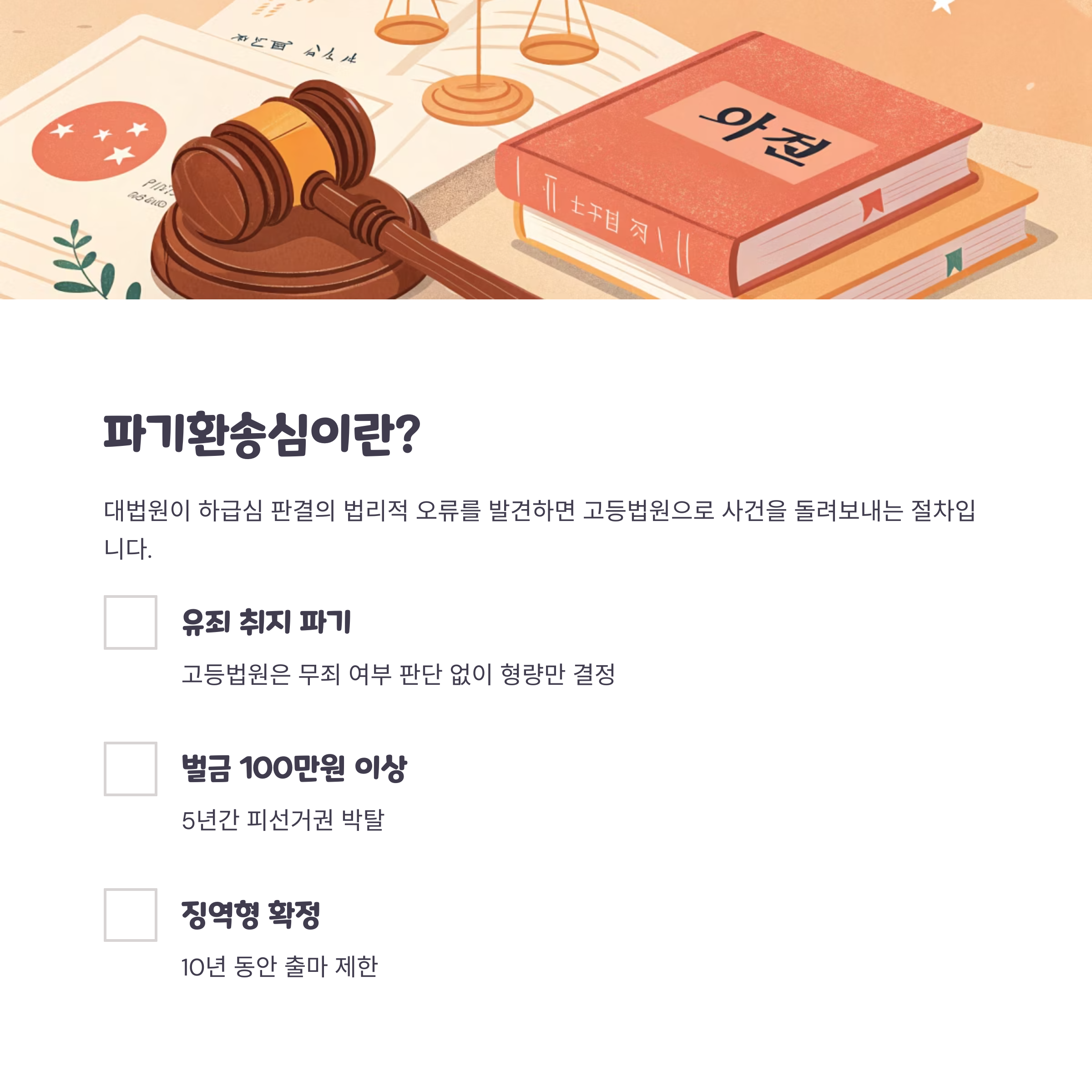 파기환송심이란 대법원이 하급심(주로 항소심)의 판결에 법리적인 오류가 있다고 판단할 경우, 해당 사건을 고등법원으로 다시 돌려보내는 절차입니다. 특히 공직선거법 위반 사건에서는 유죄 취지로 파기되면, 고등법원은 무죄 여부를 판단하지 않고 형량만을 결정합니다. 벌금 100만원 이상이 확정되면 5년간 피선거권이 박탈되고, 징역형이 확정되면 10년 동안 출마가 제한됩니다.