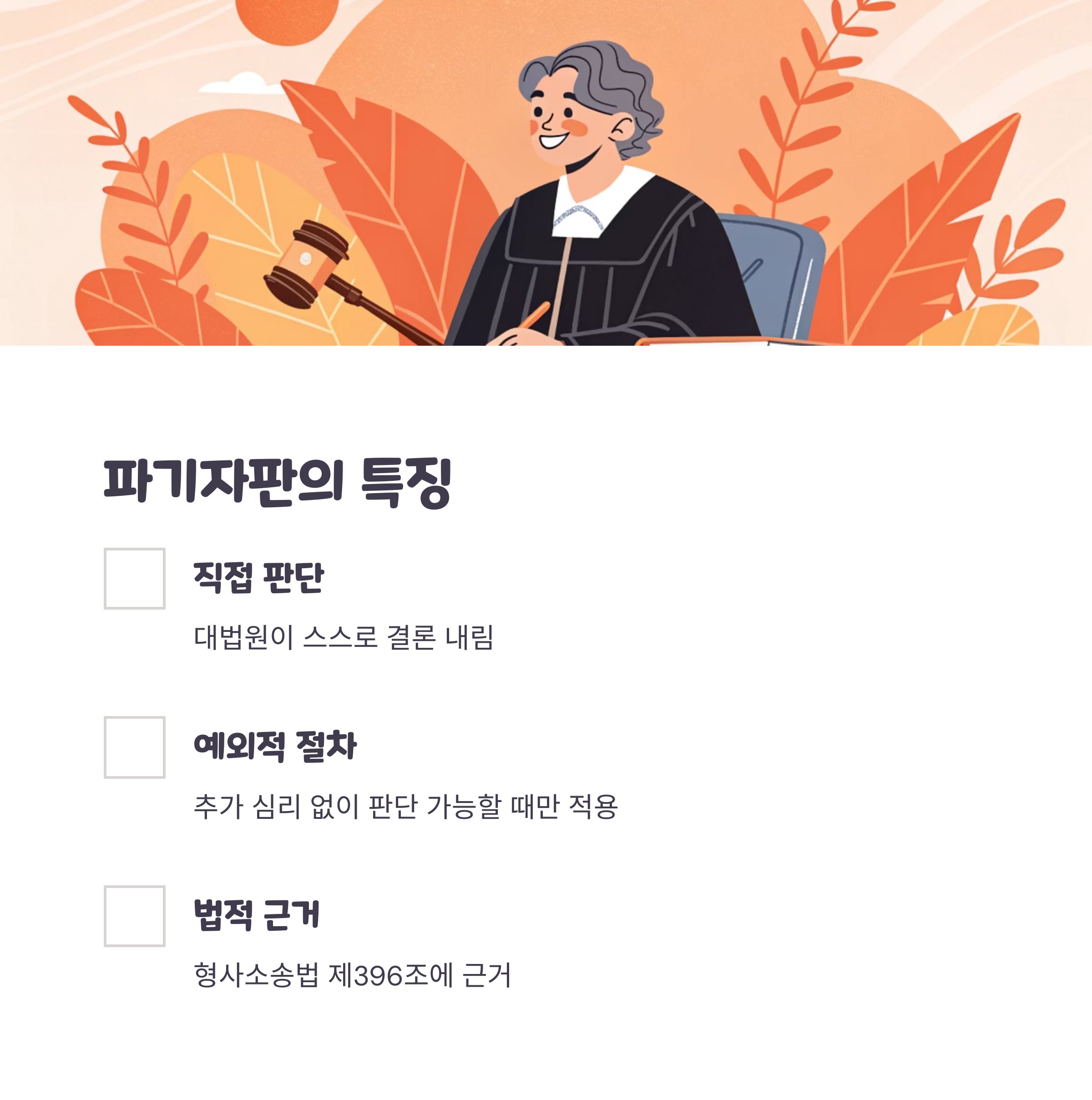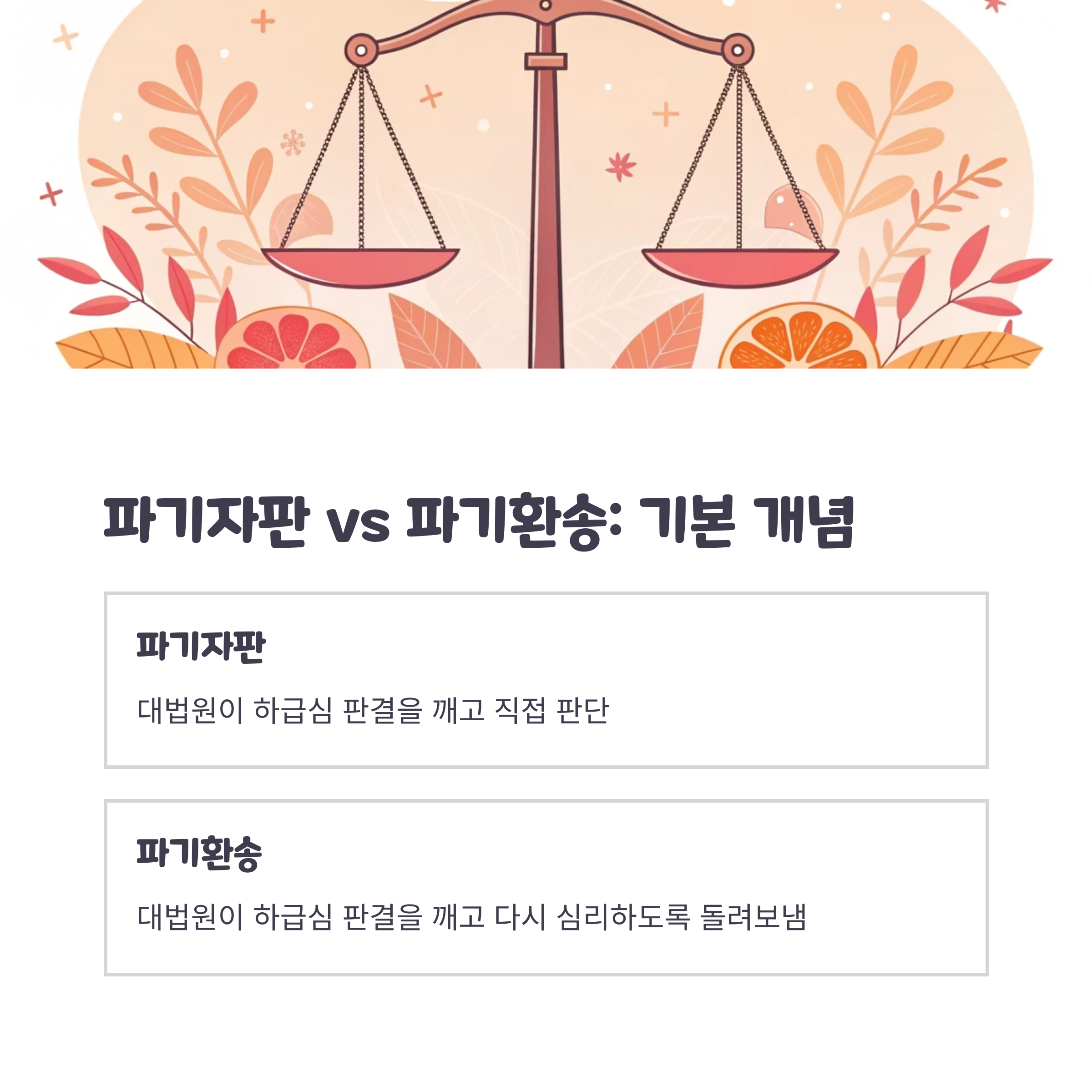 대법원이 하급심의 판단을 깨뜨리면서 사건을 직접 판단하면 '파기자판', 다시 심리하도록 돌려보내면 '파기환송'입니다. 즉, 이 용어들은 상급심의 사건 처리 방식을 보여주는 중요한 개념입니다.