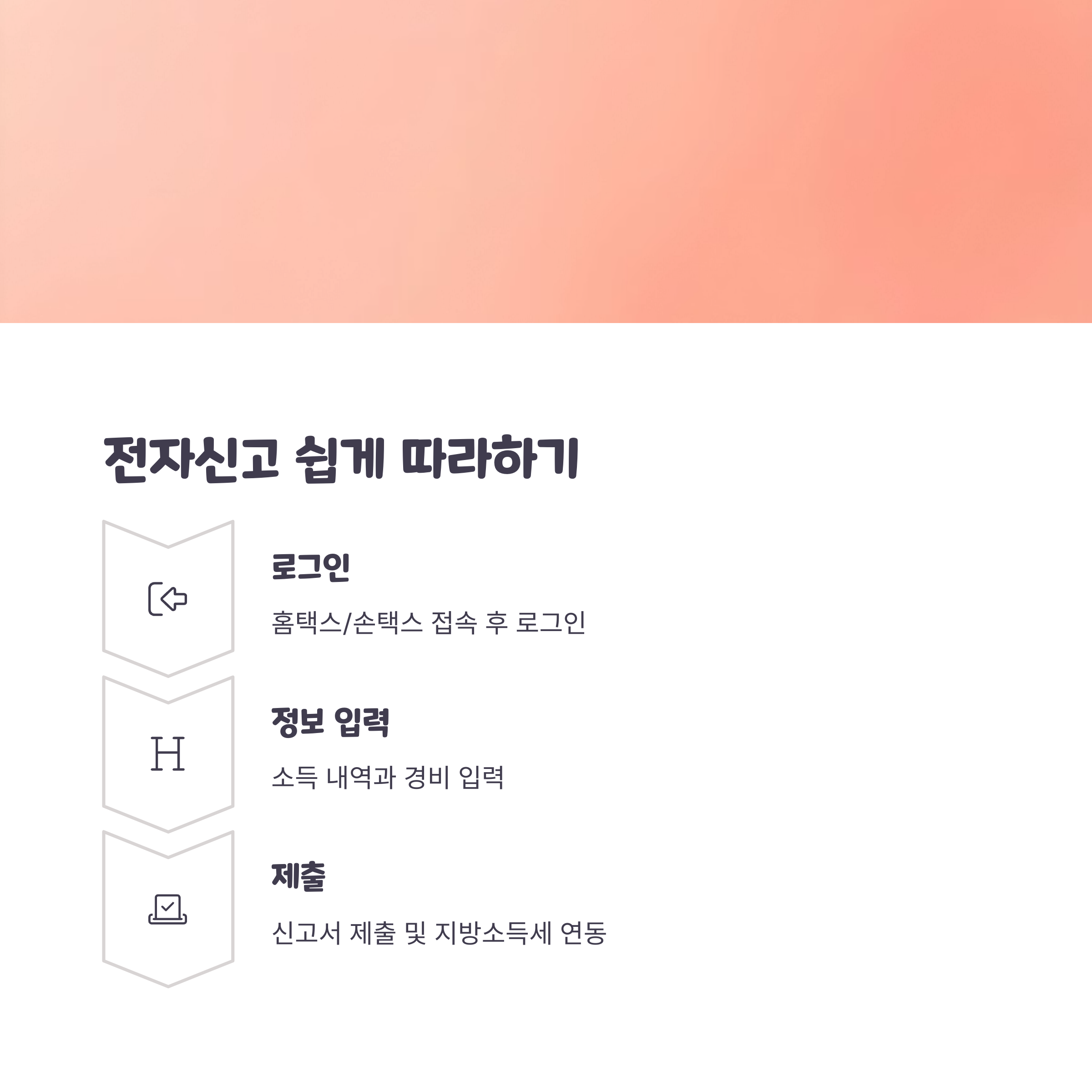 2025년 종합소득세 전자신고는 국세청 홈택스(Hometax)나 모바일 손택스 앱에서 간편하게 할 수 있습니다. 홈택스 로그인 후 ‘종합소득세 신고’ 메뉴에서 본인 인증을 완료한 뒤, 소득 내역과 경비 등을 입력하고 신고서를 제출하면 됩니다.