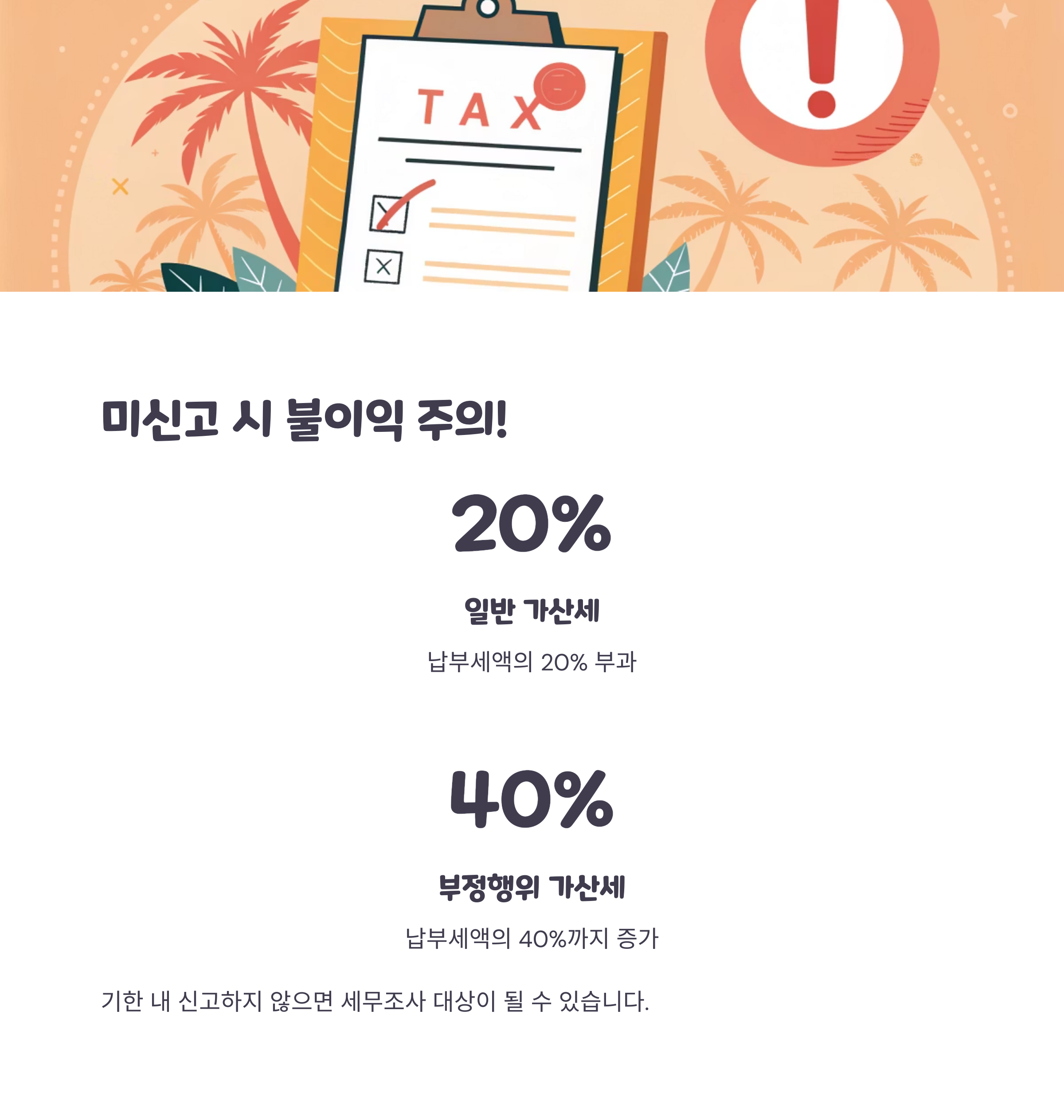 종합소득세를 기한 내 신고하지 않으면 무신고 가산세가 부과됩니다. 일반적으로는 납부세액의 20%이며, 부정행위로 간주될 경우 40%까지 증가할 수 있습니다.