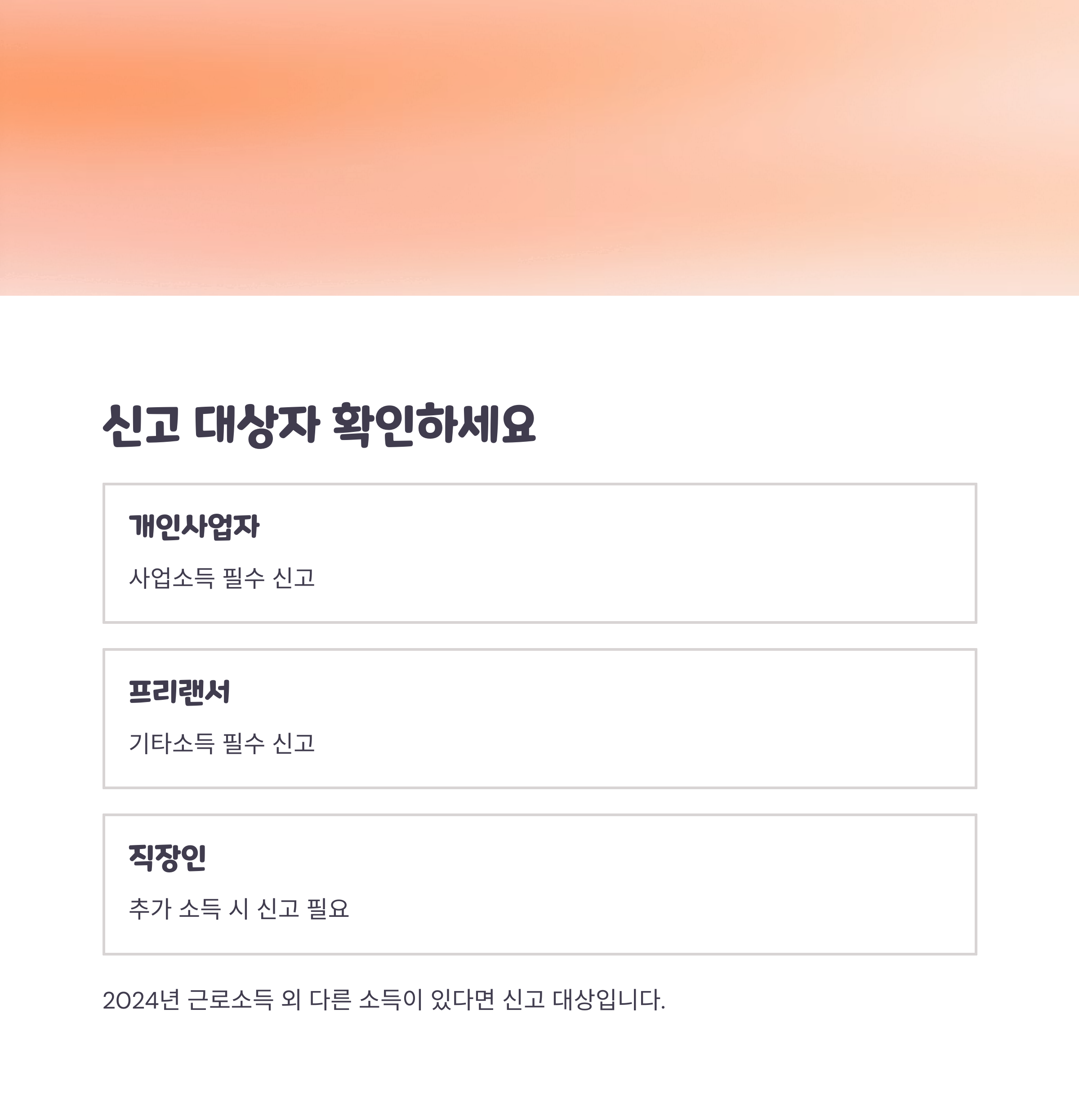 2024년 한 해 동안 근로소득 외 다른 소득이 발생한 개인은 종합소득세 신고 대상입니다. 대표적으로는 개인사업자, 프리랜서의 사업소득, 연 2,000만 원을 초과한 이자·배당소득, 부동산 임대소득, 연금 및 기타소득 등이 포함됩니다.