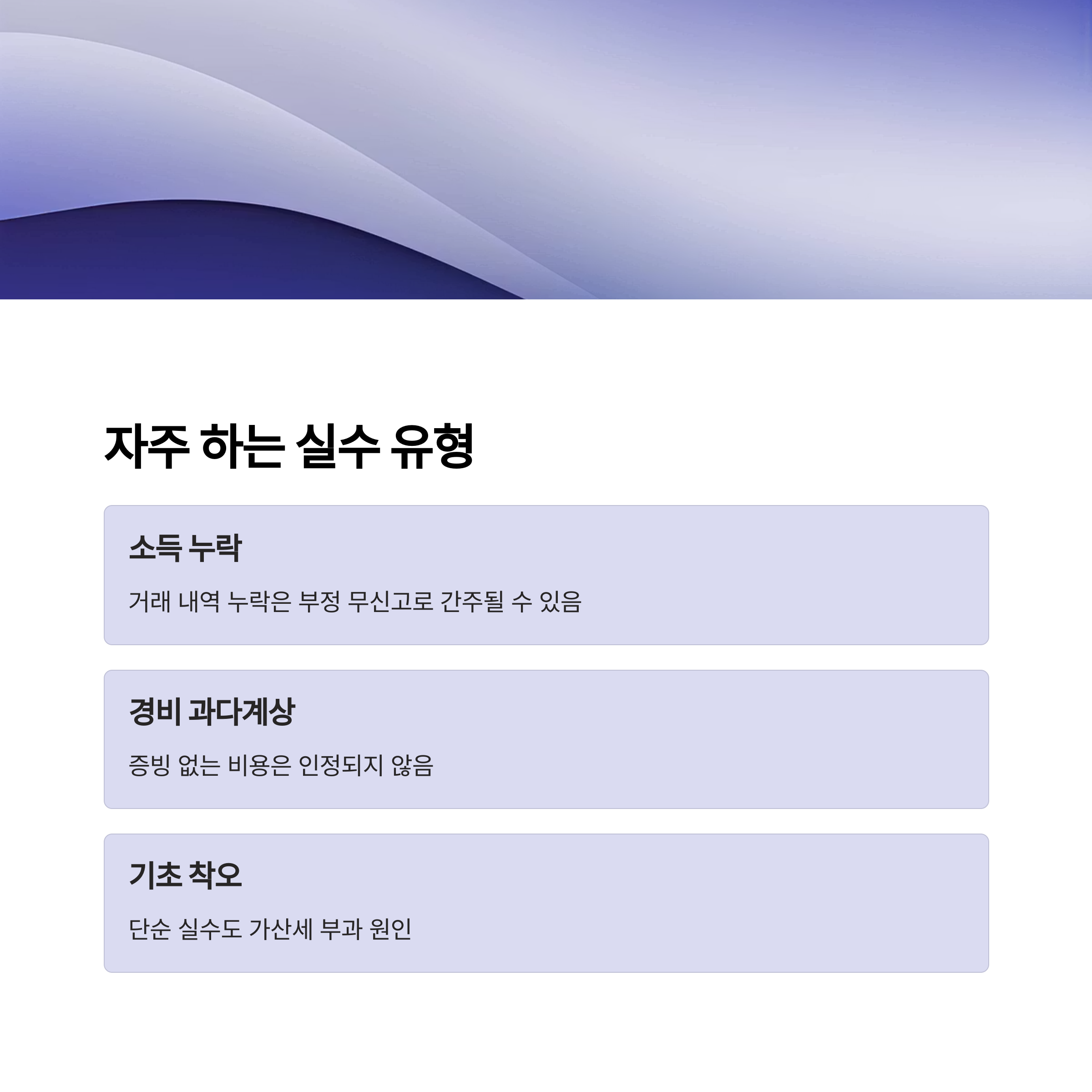 또한 경비 과다계상도 주의해야 합니다. 입증 가능한 비용만 인정되며, 증빙이 없거나 허위로 작성된 영수증은 불이익의 원인이 됩니다. 기초적인 착오로도 가산세가 부과될 수 있으니, 모든 내역을 꼼꼼히 검토하는 습관이 필요합니다.