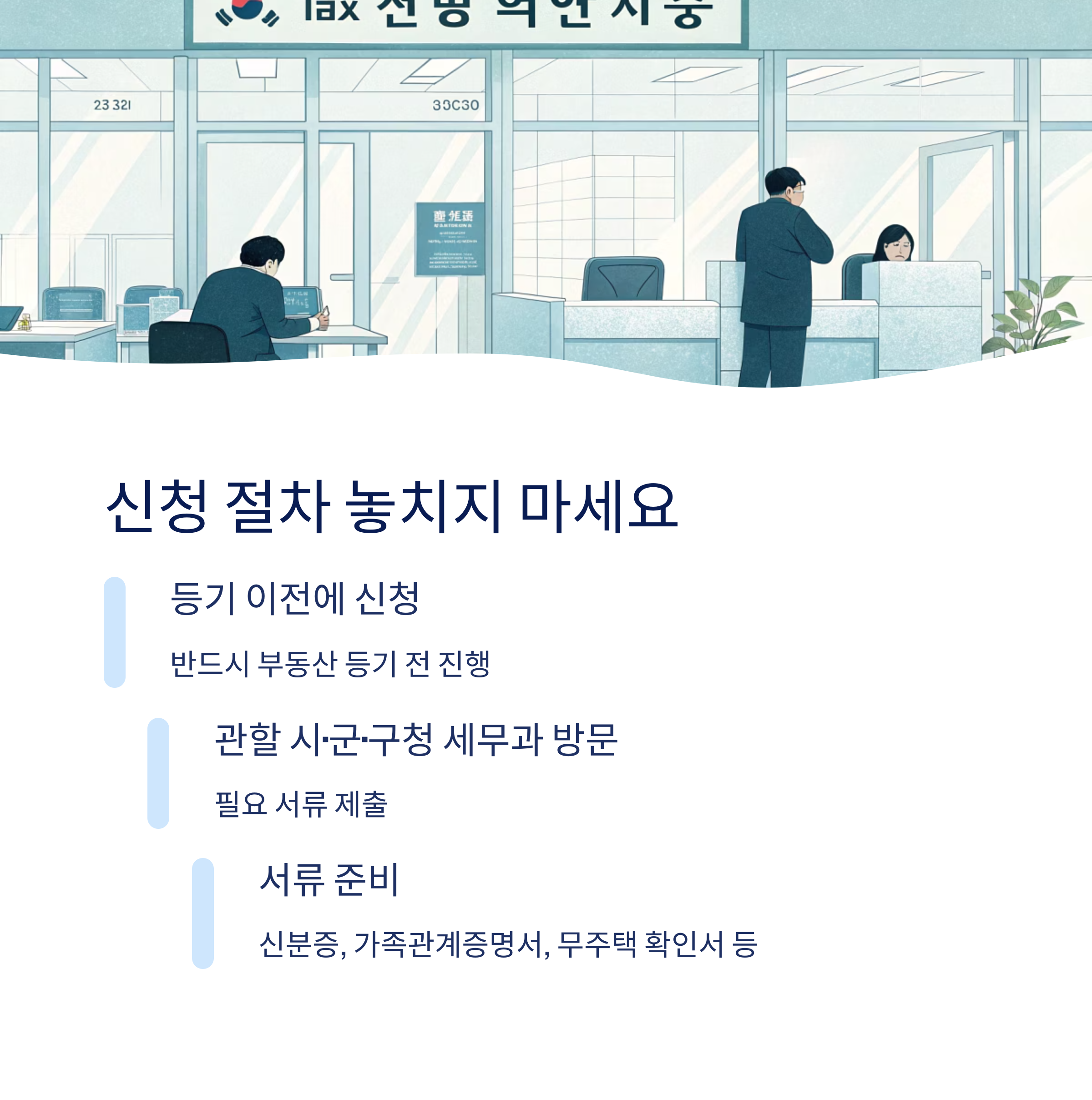 감면 신청은 부동산 등기 전에 반드시 진행해야 하며, 관할 시·군·구청의 세무부서에 서류를 제출해야 합니다. 신분증, 가족관계증명서, 무주택 확인서 등 관련 서류를 빠짐없이 준비해야 합니다. 늦게 신청하거나 요건을 충족하지 않으면 감면이 불가능하므로, 사전에 준비하고 절차를 숙지해야 합니다.
