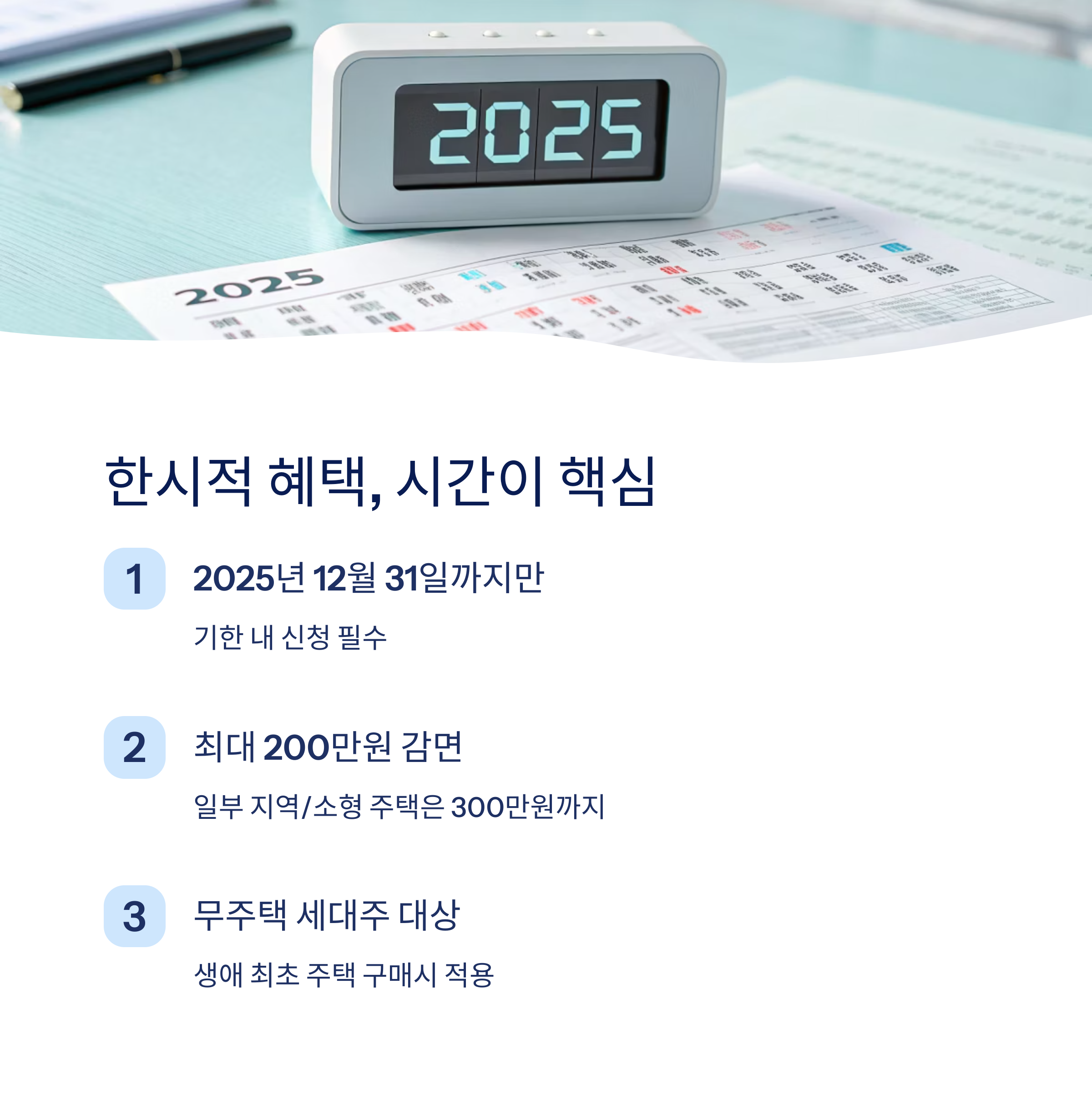 생애 첫 주택 취득세 감면 제도는 2025년 12월 31일까지 한시적으로 시행됩니다. 무주택 세대주가 생애 최초로 주택을 구매할 경우, 최대 200만 원까지 취득세를 감면받을 수 있습니다. 일부 지역 또는 전용면적이 작은 주택은 최대 300만 원까지 감면됩니다. 혜택을 받기 위해서는 정해진 기간 내에 주택을 취득하고, 관련 절차를 준수해야 합니다.