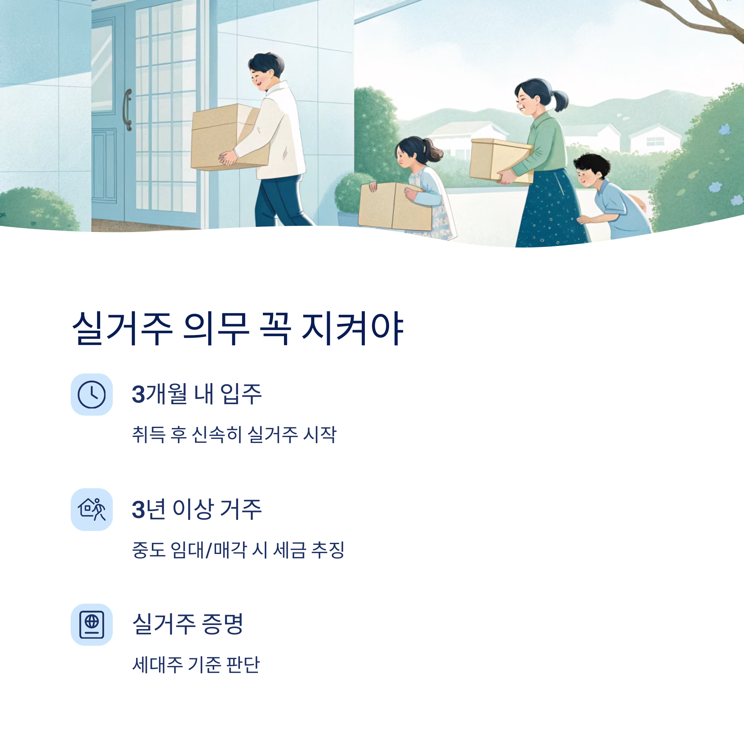 취득세 감면 혜택을 받기 위해서는 주택 취득 후 3개월 이내에 실거주를 시작해야 합니다. 또한, 최소 3년 이상 해당 주택에 거주해야 하며, 중간에 임대를 놓거나 매각하면 세금이 추징될 수 있습니다. 실거주 의무는 세대주 기준으로 판단되며, 실거주 사실을 입증할 수 있어야 합니다.