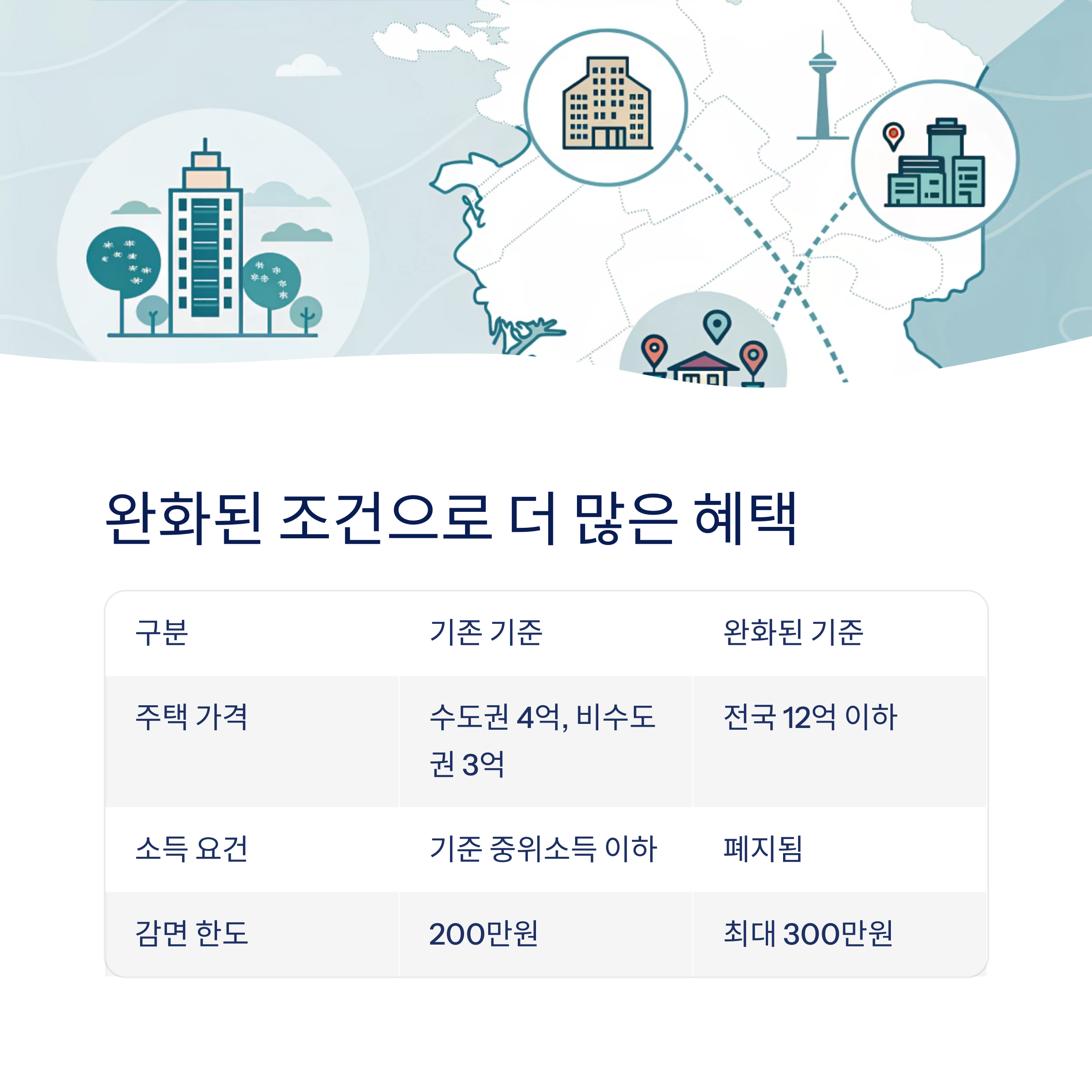감면 대상은 주택을 취득할 당시 본인과 배우자 모두 무주택자여야 합니다. 주택 가격 기준도 완화되어, 현재는 12억 원 이하 주택까지 감면이 적용됩니다. 과거에는 수도권 4억 원, 비수도권 3억 원이었지만, 보다 폭넓은 실수요자들이 혜택을 누릴 수 있게 되었습니다. 소득 요건은 완전히 폐지되어, 주택 가격 요건만 충족하면 누구나 신청 가능합니다.