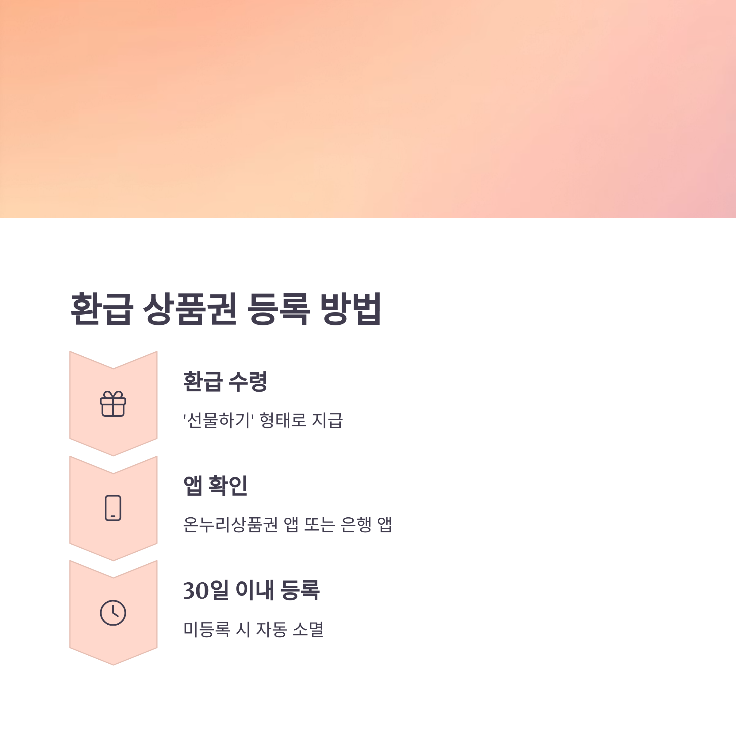 환급은 '선물하기' 형태로 지급되며, 사용자는 지급받은 후 30일 이내에 상품권 등록을 완료해야 합니다. 등록은 온누리상품권 앱 또는 연결된 은행 앱을 통해 간편하게 가능합니다.