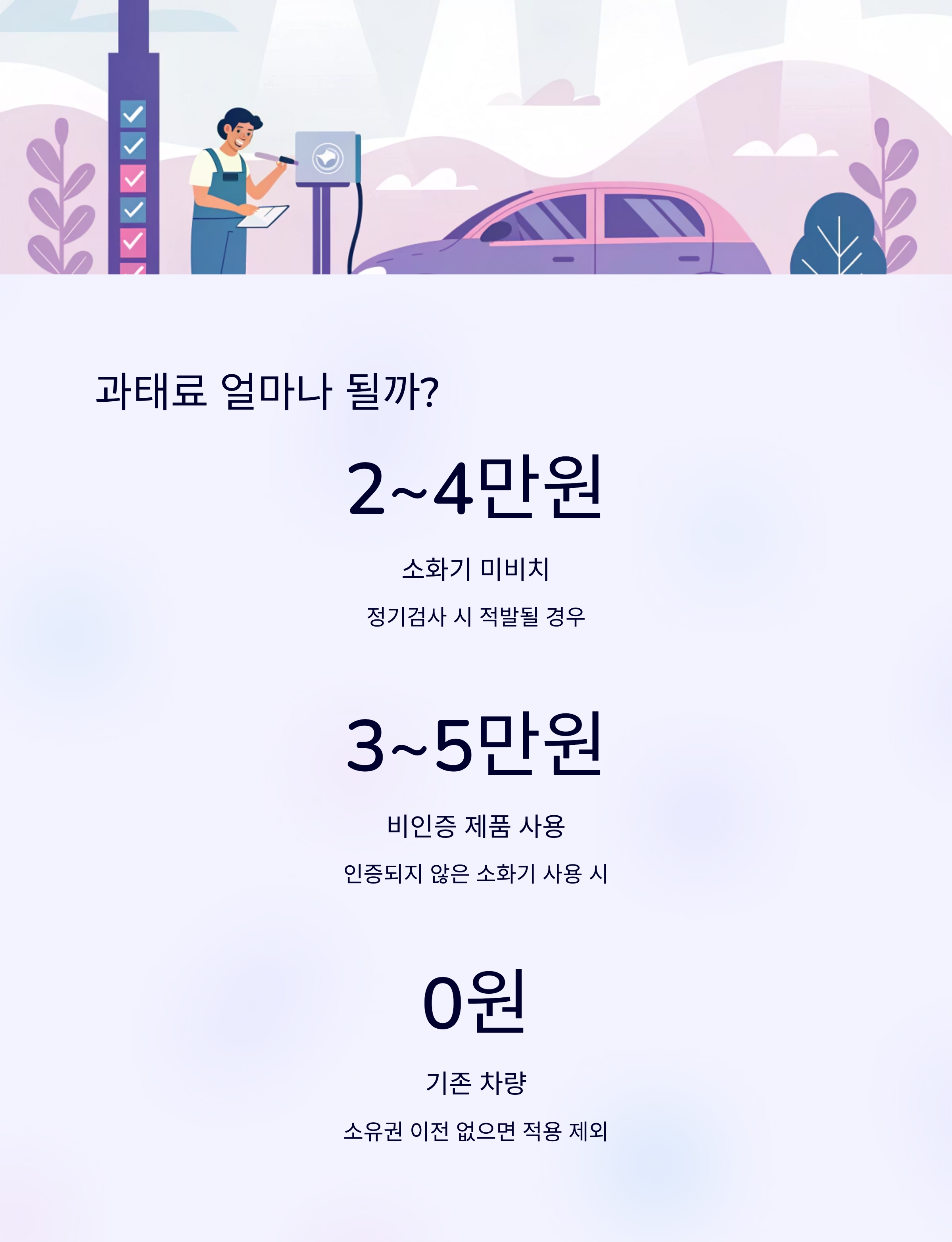 차량용 소화기 미비치는 자동차 정기검사에서 확인됩니다. 이 때 기준 미달 제품 사용이나 소화기 부재가 적발되면 과태료 부과 또는 정비 지시를 받을 수 있습니다.