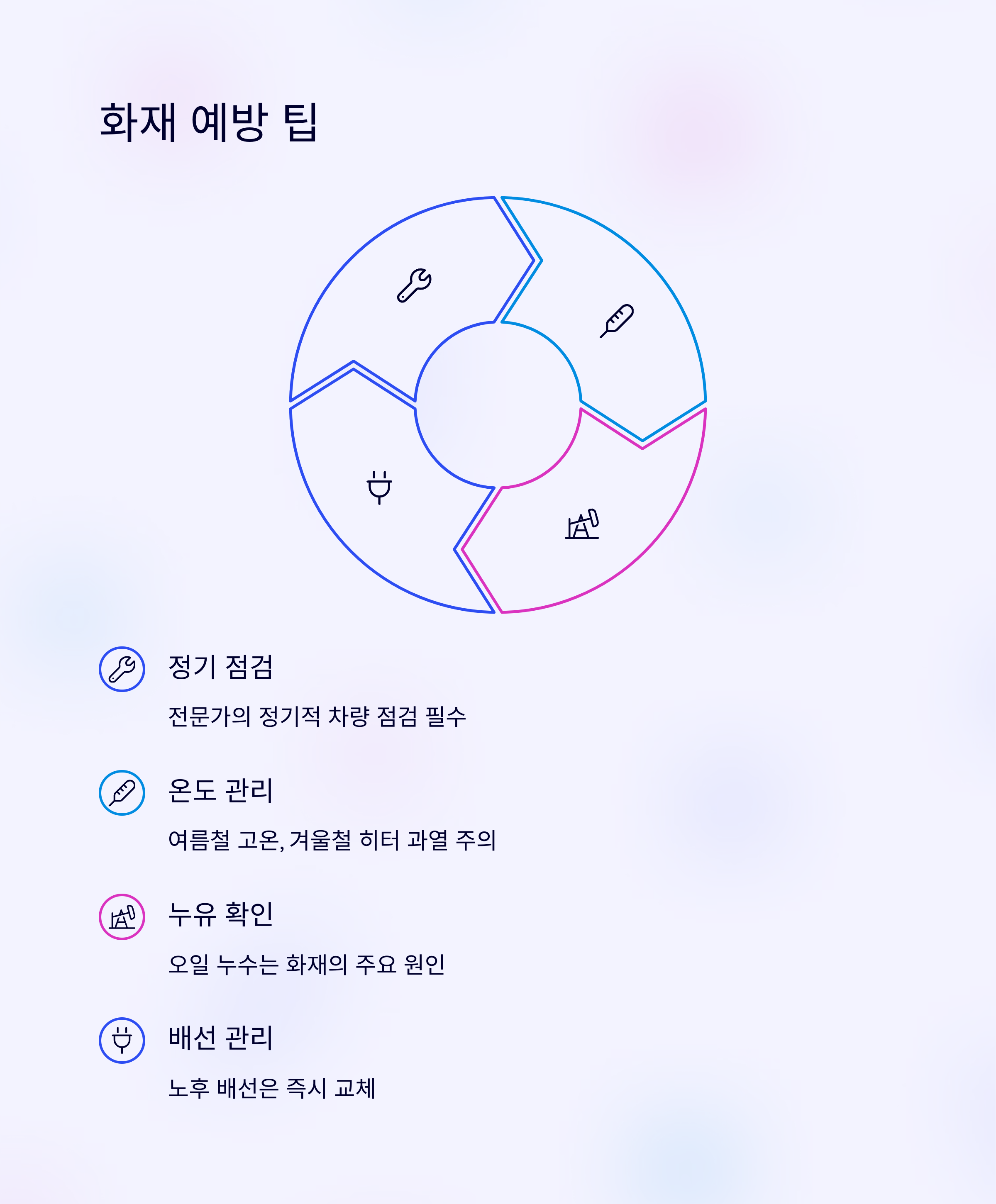차량 화재는 대부분 배선 노후, 과열, 누유 등 관리 소홀에서 비롯됩니다. 소화기를 비치하는 것도 중요하지만, 정기적인 차량 점검과 소모품 관리가 더욱 중요합니다.