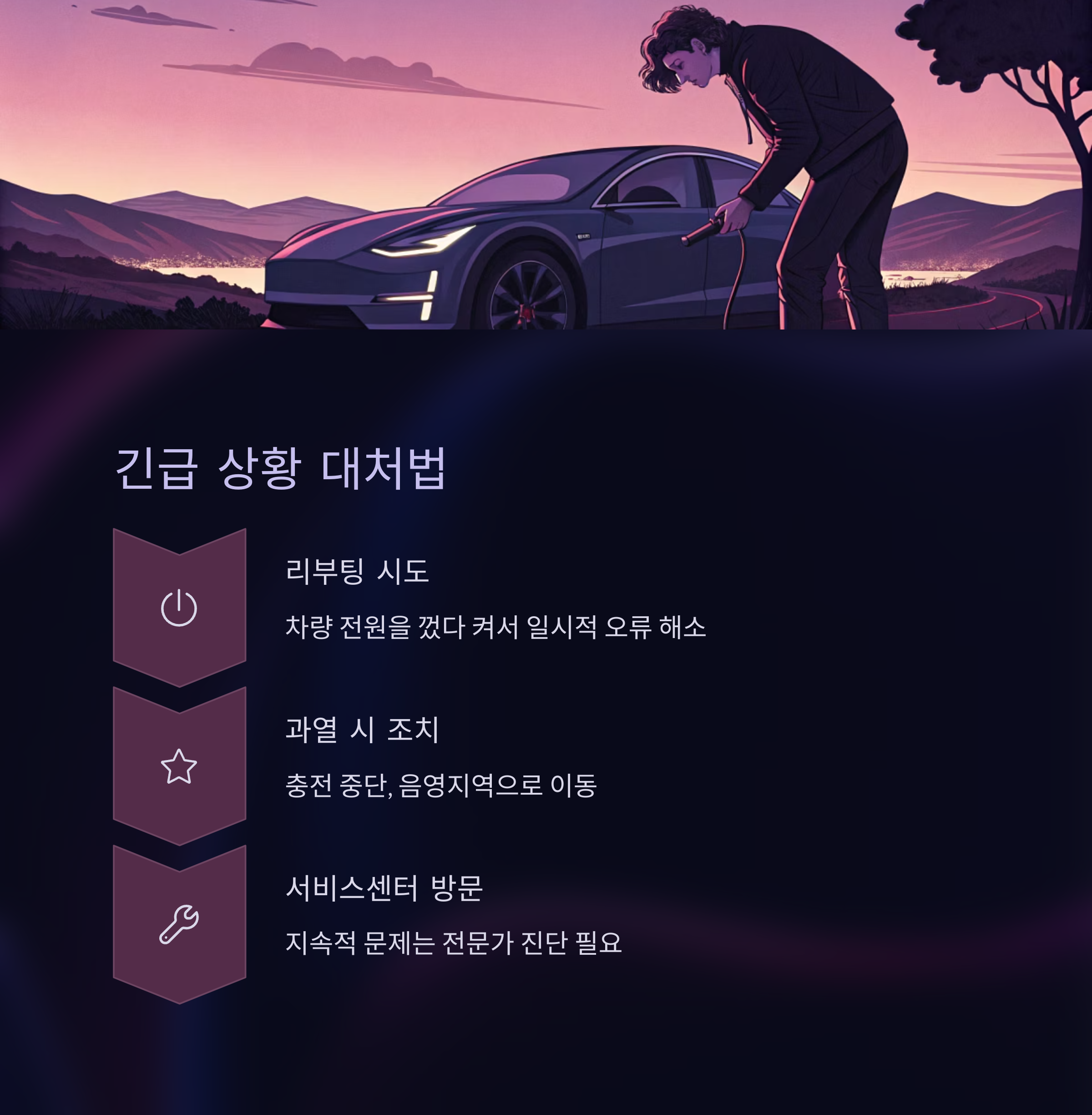 만약 전기차가 주행 중 갑자기 멈추거나 충전이 되지 않는다면, 당황하지 말고 기본 조치를 수행해야 합니다. 우선 차량 전원을 껐다가 다시 켜는 '리부팅' 방식으로 일시적인 오류를 해소할 수 있습니다. 그래도 문제가 지속되면 가까운 공식 서비스센터로 차량을 이동시켜 정밀 점검을 받는 것이 중요합니다. 특히 충전 중 과열 현상이 발생한 경우 즉시 충전을 중단하고, 차량을 음영지역에 이동시켜 냉각을 유도해야 합니다.