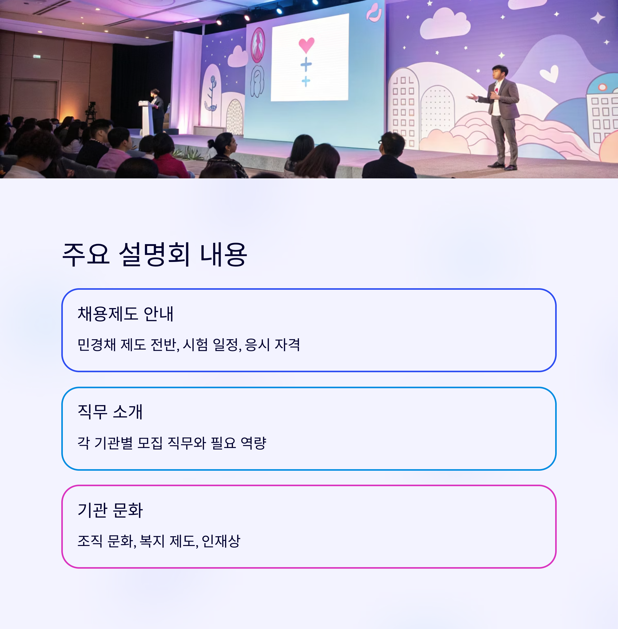 이번 설명회에서는 민경채 제도 전반을 비롯해 시험 일정, 응시 자격, 직무 소개 등이 상세히 안내됩니다. 또한 각 기관별 조직 문화, 복지 제도, 인재상 등에 대한 정보도 함께 제공돼, 지원자들이 실제 지원 여부를 결정하는 데 큰 도움이 될 것입니다. 실시간 채팅을 통해 궁금한 점을 바로 질문하고 답변받을 수도 있습니다.