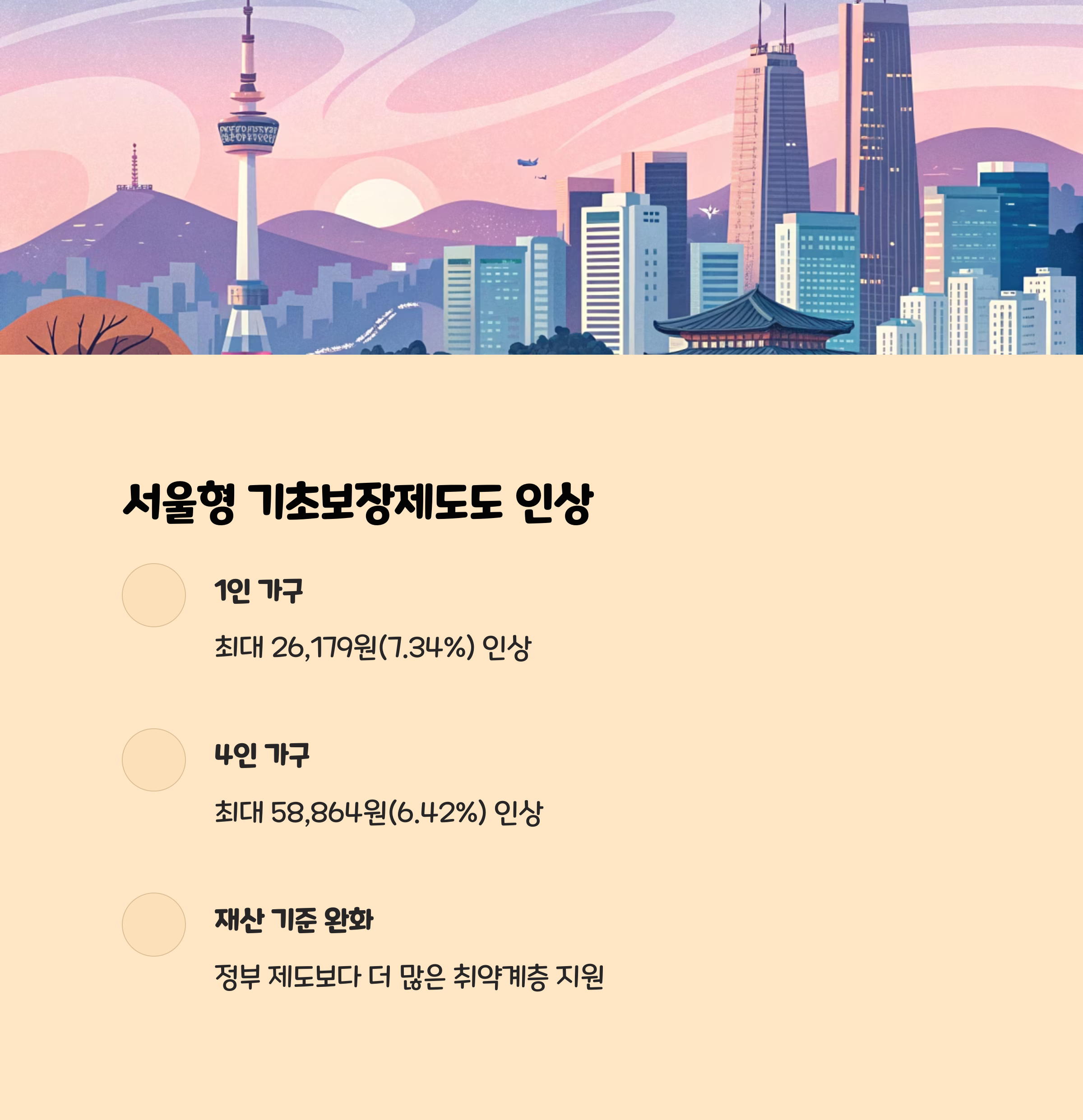 서울시의 자체 복지제도인 ‘서울형 기초보장제도’ 역시 2025년 기준으로 1인 가구 최대 26,179원(7.34%), 4인 가구 58,864원(6.42%) 인상됩니다. 서울형 제도는 재산 기준이 더 완화되어 있어, 정부 제도에서 보호받지 못하는 취약계층도 폭넓게 지원합니다.
