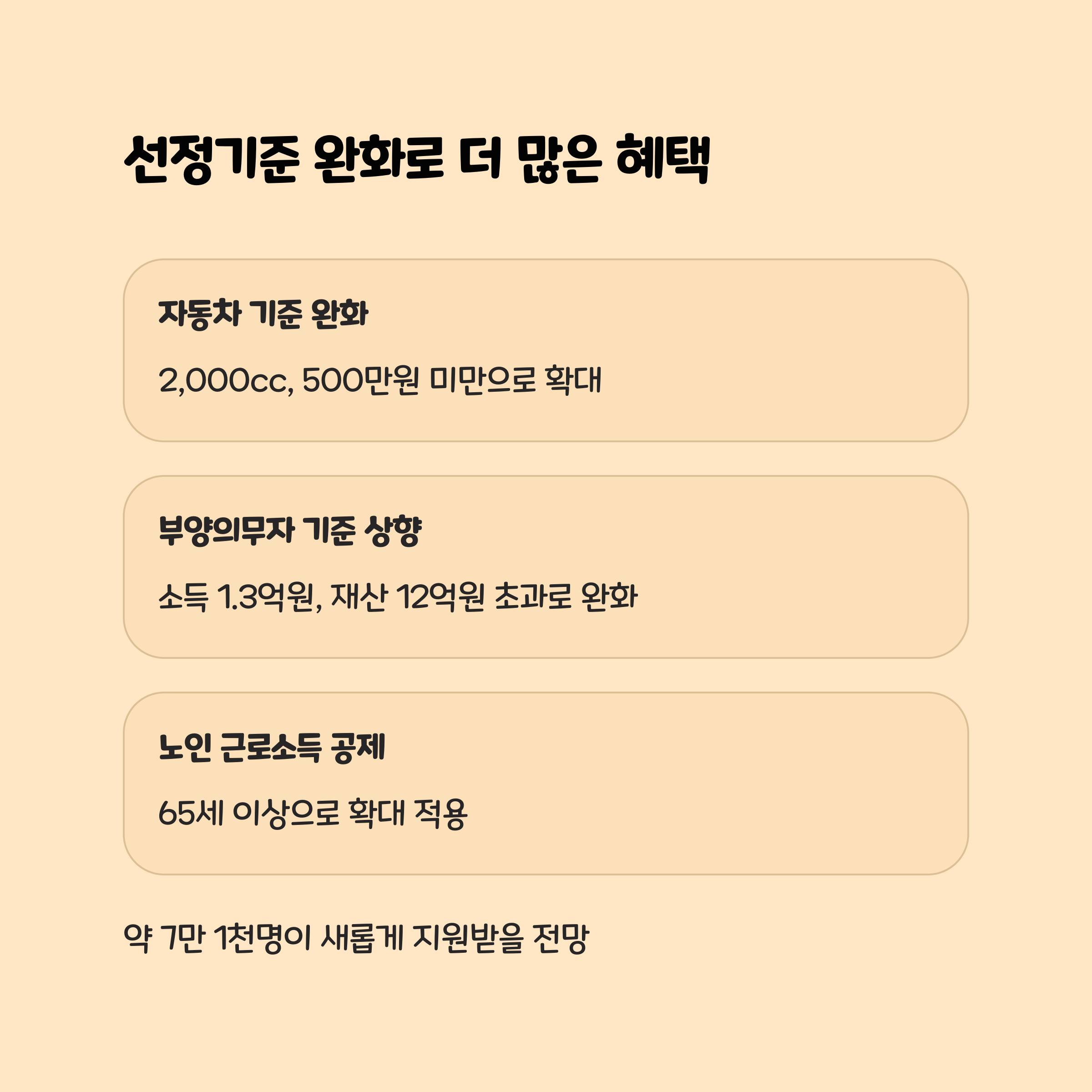- 자동차 재산 기준 완화: 기존 1,600cc, 200만원 미만에서 2,000cc, 500만원 미만으로 확대
