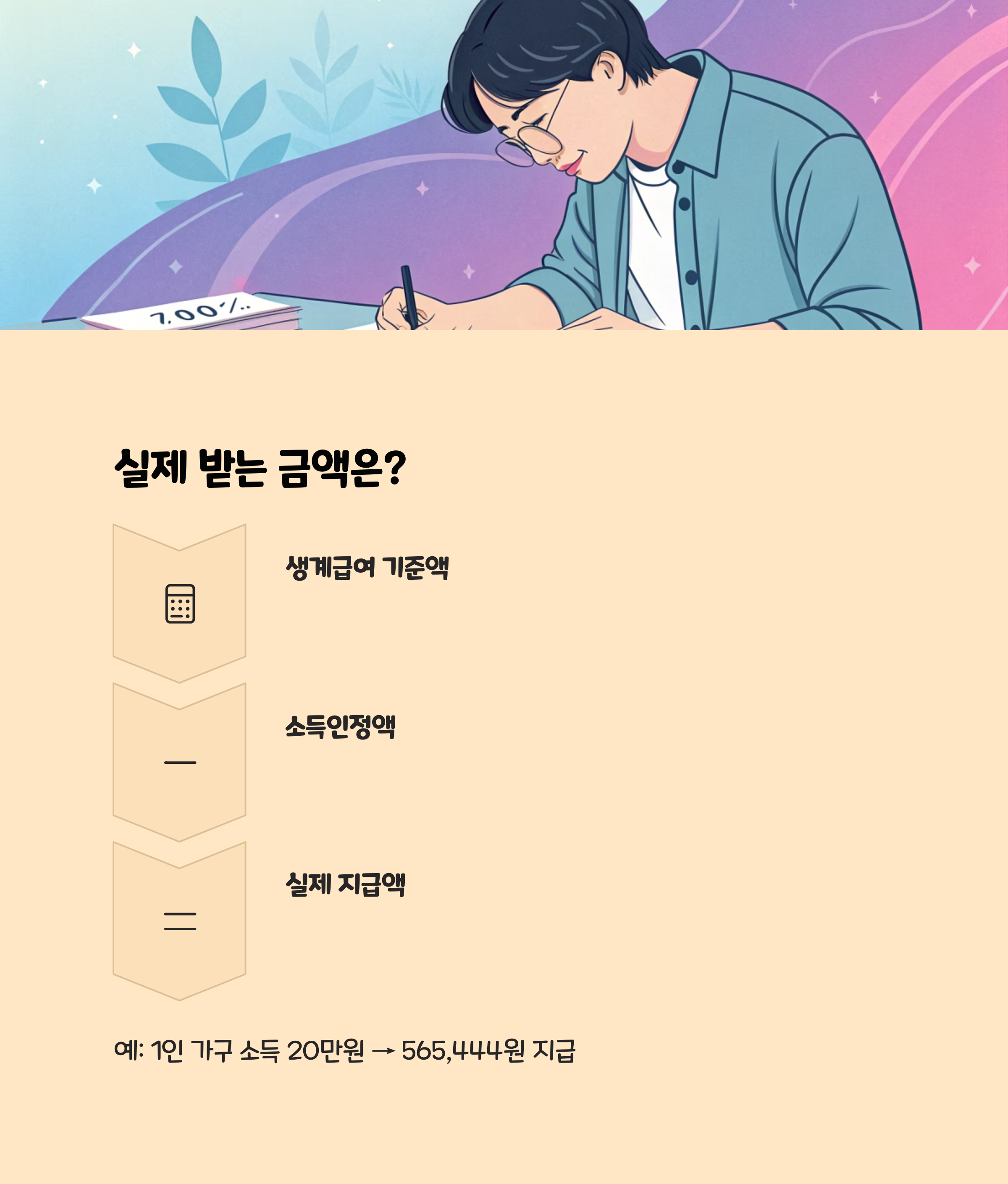 실제 지급받는 생계급여는 ‘생계급여 기준액’에서 해당 가구의 소득인정액(소득평가액+재산의 소득환산액)을 뺀 금액입니다. 예를 들어, 1인 가구의 소득인정액이 20만원이라면 765,444원에서 20만원을 뺀 565,444원을 받게 됩니다. 소득인정액이 0원이면 전액을 지급받습니다.