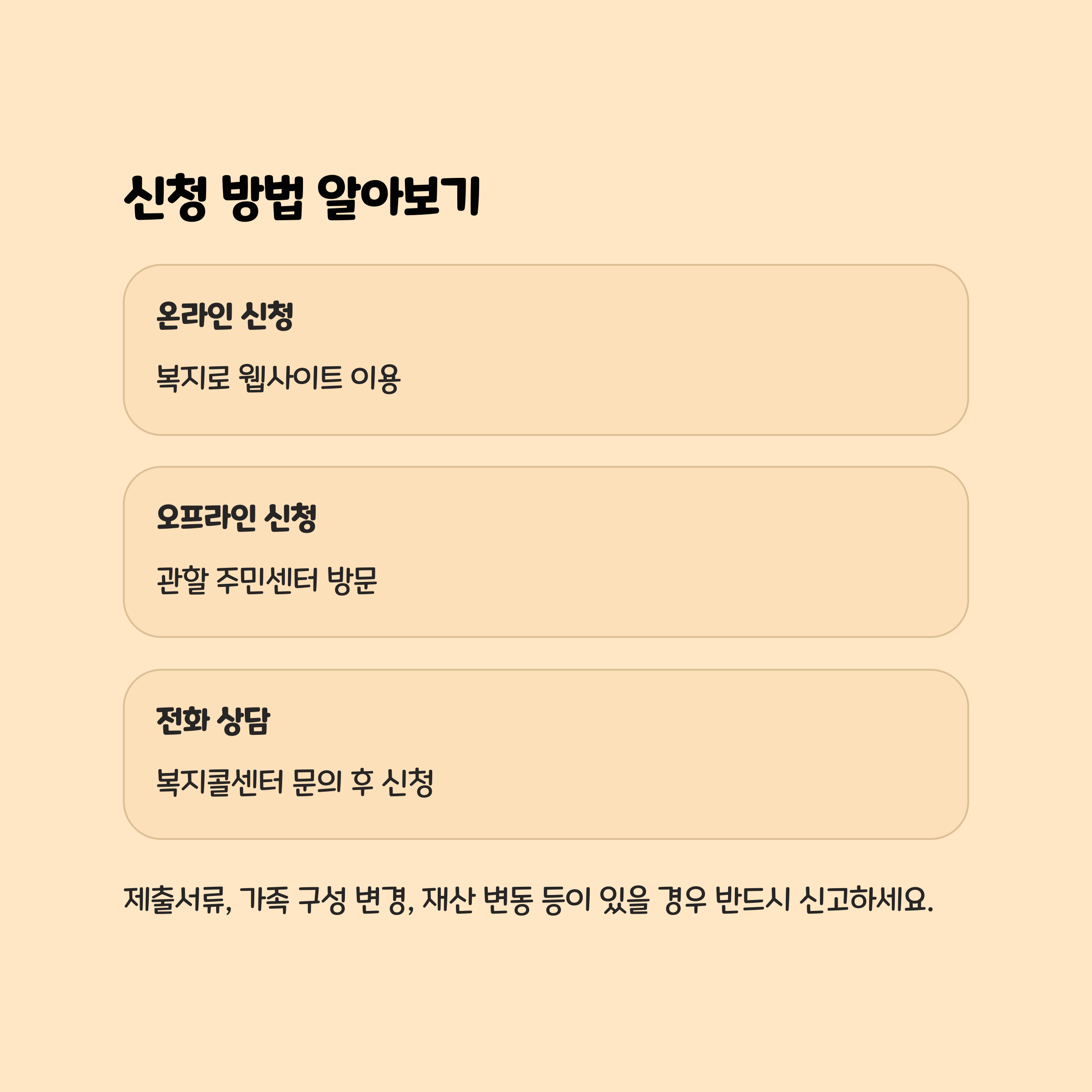 복지로 외에도 관할 주민센터 방문이나 복지콜센터를 통해 상담 후 신청할 수 있습니다. 제출서류, 가족 구성 변경, 재산 변동 등이 있을 경우 반드시 신고해야 혜택 누락을 막을 수 있습니다. 담당자의 안내를 따라 정확히 신청하세요.